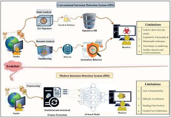 ML and deep learning (DL) algorithm adaptation in IDSs has introduced intelligent IDSs that significantly optimize detection rates. These ML/DL-based IDSs are adopted because they demonstrate superior robustness, accuracy, and extensibility compared with traditional detection techniques like rule-based, signature-based, and anomaly-based detection [,]. These complex algorithms’ foundation lies in mathematical and statistical concepts that perform pattern discovery, correlation analysis, and structured data disparity representation through probabilities and confidence intervals [,]. ML primary types include supervised, semi-supervised, unsupervised, reinforcement, and active learning techniques, each serving specific security application purposes []. Despite the intelligent AI-based module’s effectiveness, opaque/black-box model transparency and prediction justification remain uncertain. This lack of insights into opaque AI model decision-making systems raises trust issues for Industry 5.0 adoption [].