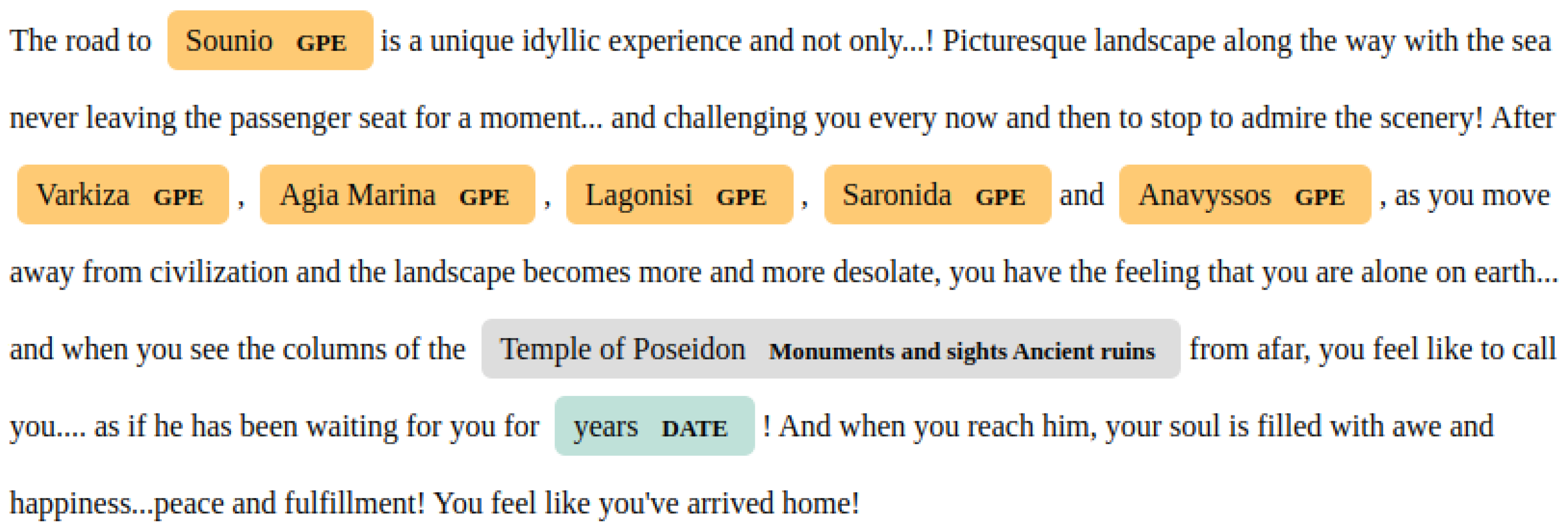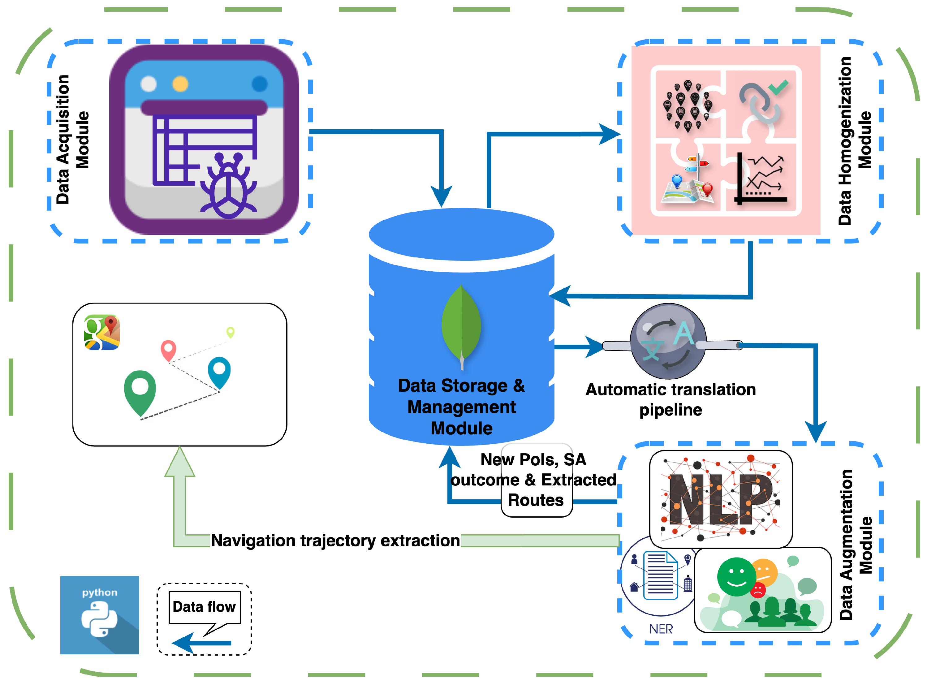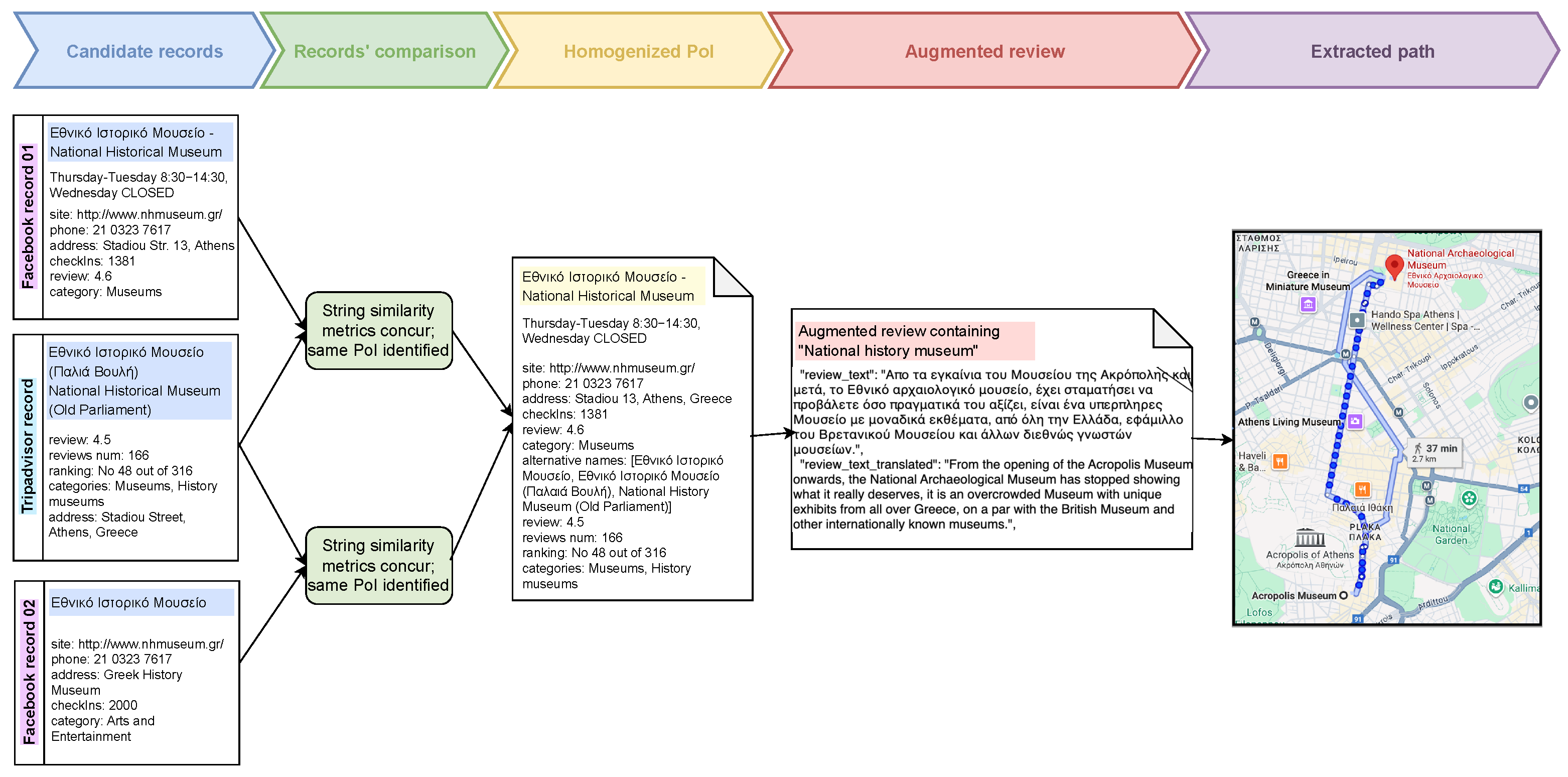 - We propose an innovative, integrated data lake framework capable of meeting several requirements posed by the CI, CH and tourism sectors, such as (a) acquiring cultural data from diverse online endpoints, (b) storing and managing information in properly configured NoSQL data collections, (c) applying data homogenization methods combining multiple string similarity measures with geolocation material, (d) identifying additional PoIs by employing NER language models, and (e) performing opinion mining on user reviews applying sentiment analysis pipelines. The framework exploits the augmented information to derive touristic and cultural routes based on personalized experiences of people who have already traveled there.