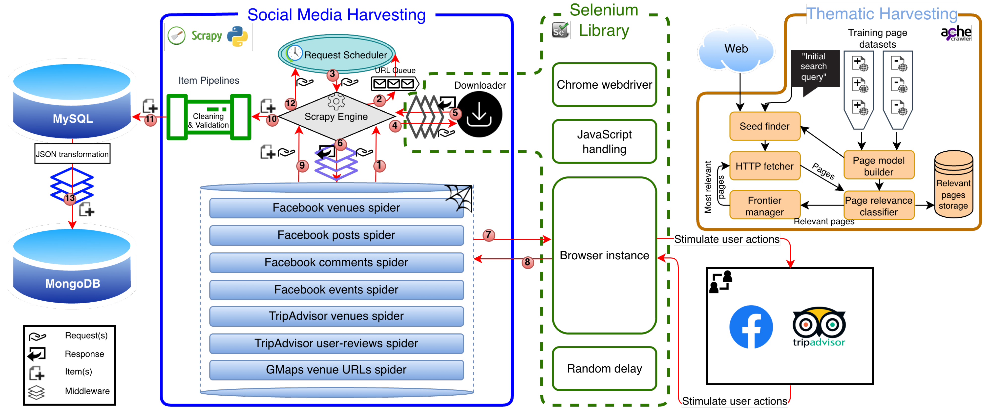 - The Social Media Harvesting unit, which traverses through the social media public pages, identifying the targeted information, extracting and storing it in a suitably structured database. It encompasses task-specific web scraping modules termed spiders, and a coordination unit which initiates scraping tasks, delegating each task to the appropriate spider, and receives the harvested data for analysis, structuring, and storage. If additional sources of information are identified in the retrieved content, the coordination unit launches additional scraping tasks. The Social Media Harvesting unit is described in detail in Section 3.1.