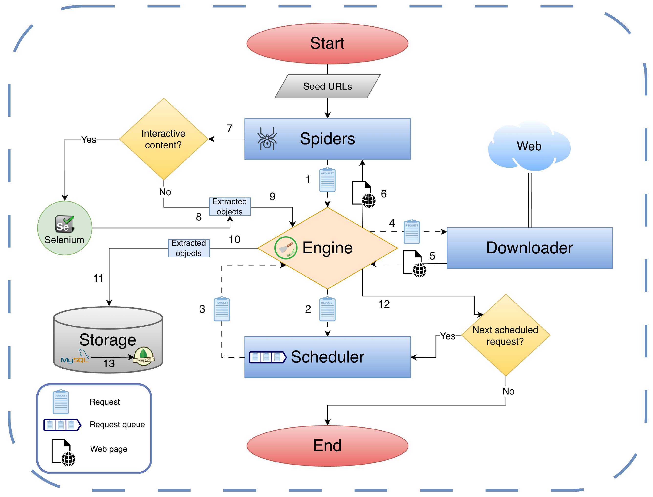 - The Engine continues requesting the next items from the Scheduler, repeating the process until all scheduled requests are completed.