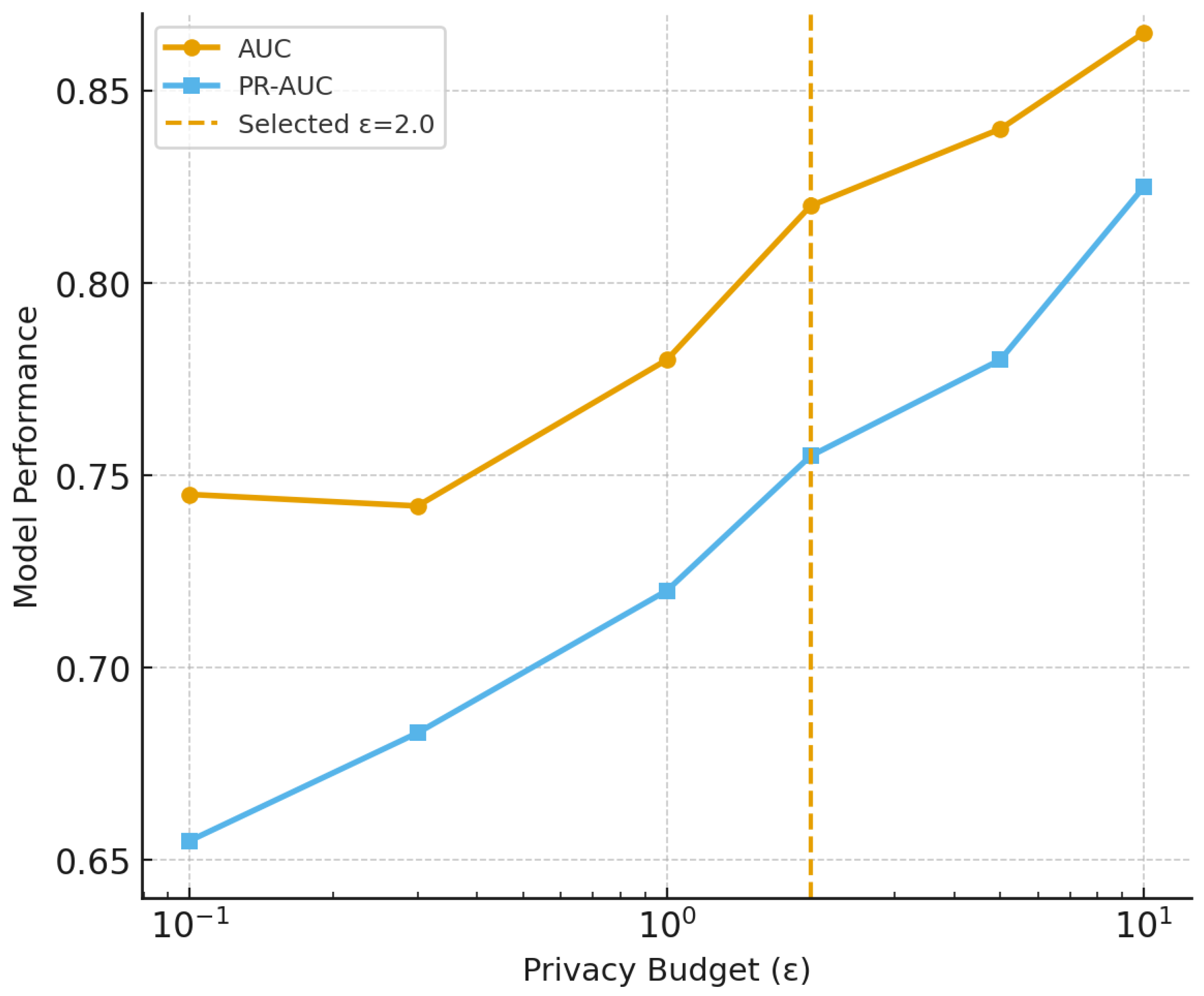 Our differential privacy implementation employs local differential privacy using the Gaussian mechanism, where noise is added by each client before transmitting model updates. We specify and for healthcare scenarios, and and for financial applications, reflecting higher privacy requirements in financial contexts. The sensitivity parameter was empirically estimated for normalized model updates through calibration runs. The aspect employs multiple anomaly detection algorithms including isolation forests, one-class support vector machines, and autoencoder-based approaches to capture different types of anomalous behavior. For model updates, the aspect analyzes parameter magnitudes, gradient directions, and update frequencies to identify potential model poisoning attacks. For data-related anomalies, the aspect examines statistical properties, distribution characteristics, and quality metrics to detect data poisoning attempts.
