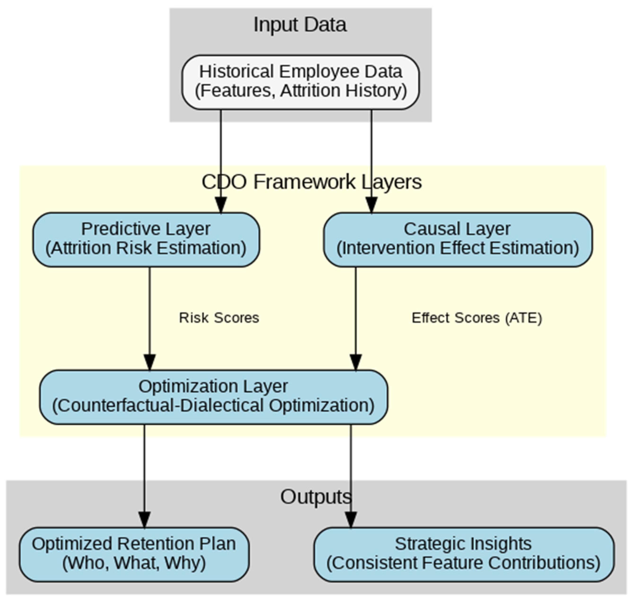 - Predictive & Causal Layers: This data is processed in parallel by the Predictive Layer, which estimates attrition risk, and the Causal Layer, which estimates the effect of potential interventions.