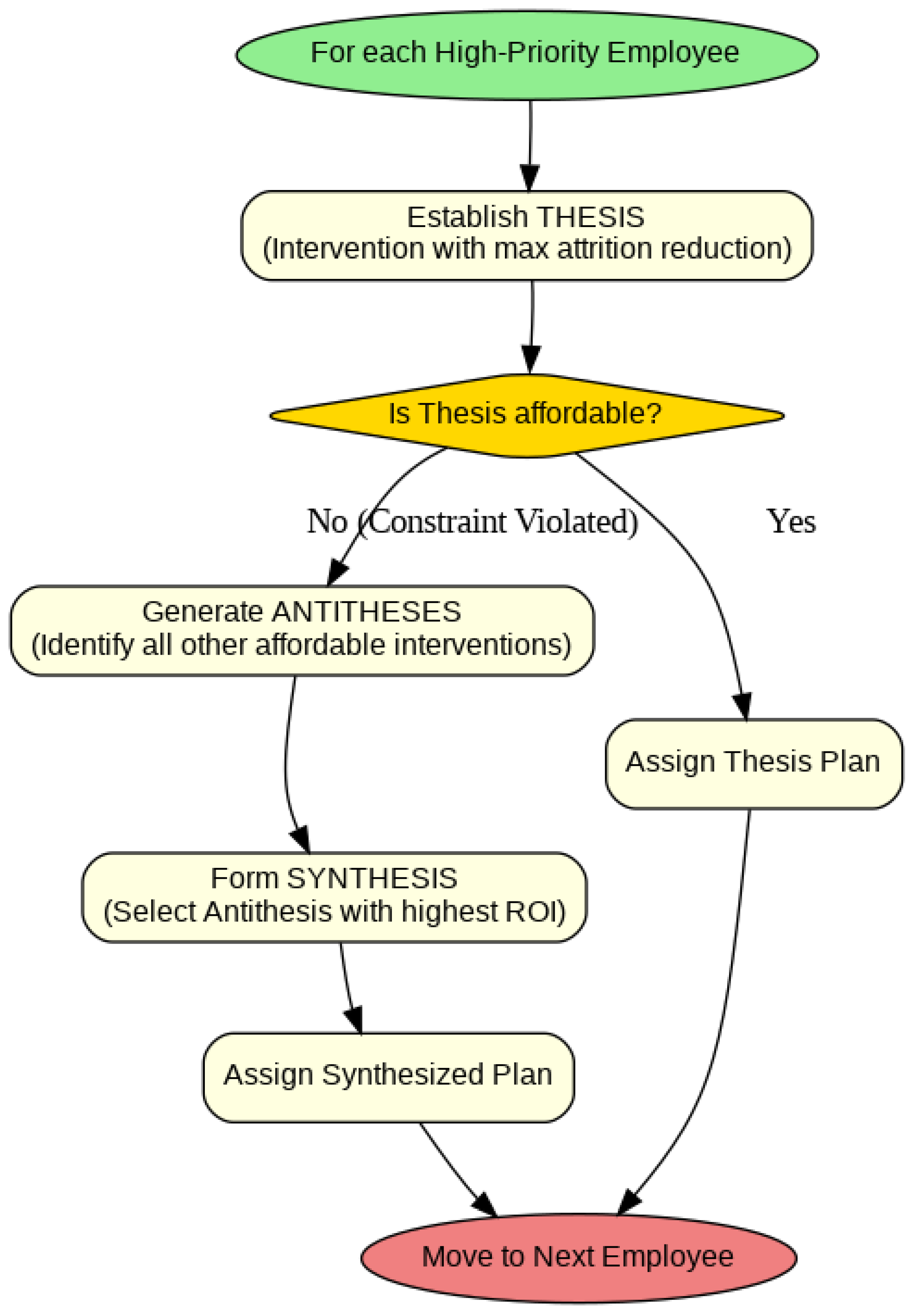 | 3 | Dialectical Optimization | Optimize (re, ATE(we), B) → π(e) | Apply a dialectical search heuristic to assign the best affordable interventions (π) to high-priority employees under a budget (B), weighting by the Employee Importance Score (we) |