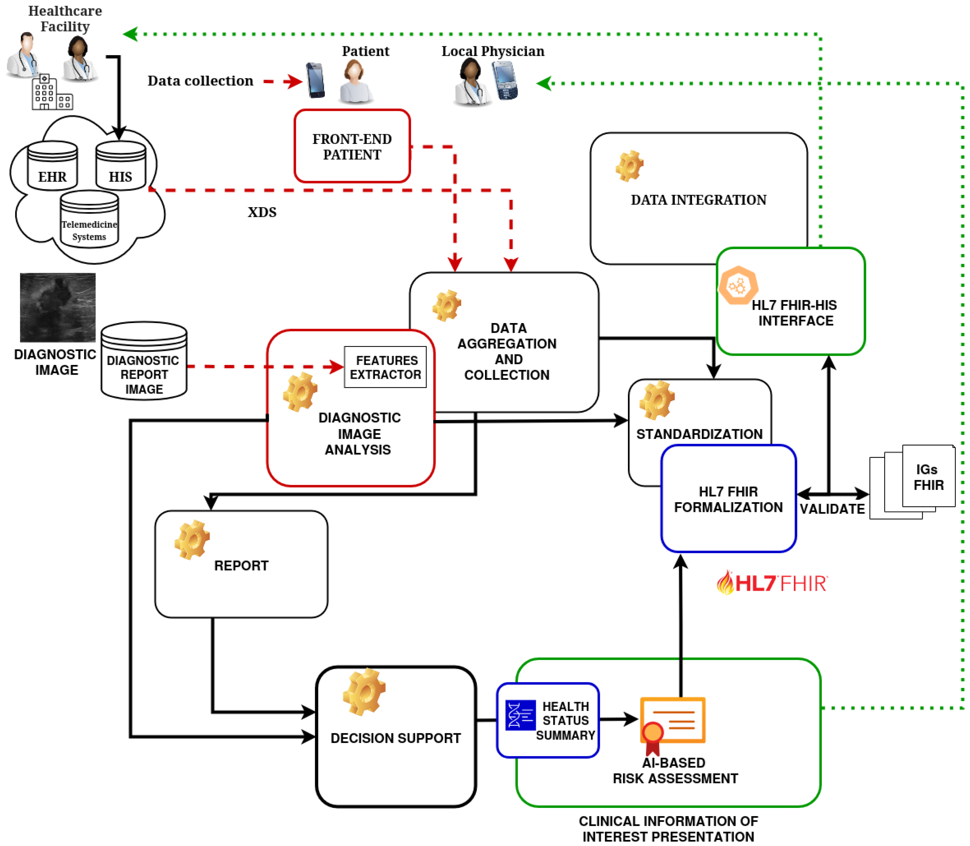 - Data Interoperability: Existing clinical systems do ot provide an integrated and patient-centered ecosystem that unifies anamnesis, structured clinical documents, diagnostic imaging, and AI-based decision support within a single workflow. The proposed architecture addresses this gap by integrating patient historical records, diagnostic imaging data, and risk assessment information originating from heterogeneous data sources. Interoperability is ensured through compliance with the HL7 FHIR standard, facilitating standardized data exchange and semantic consistency across HISs.