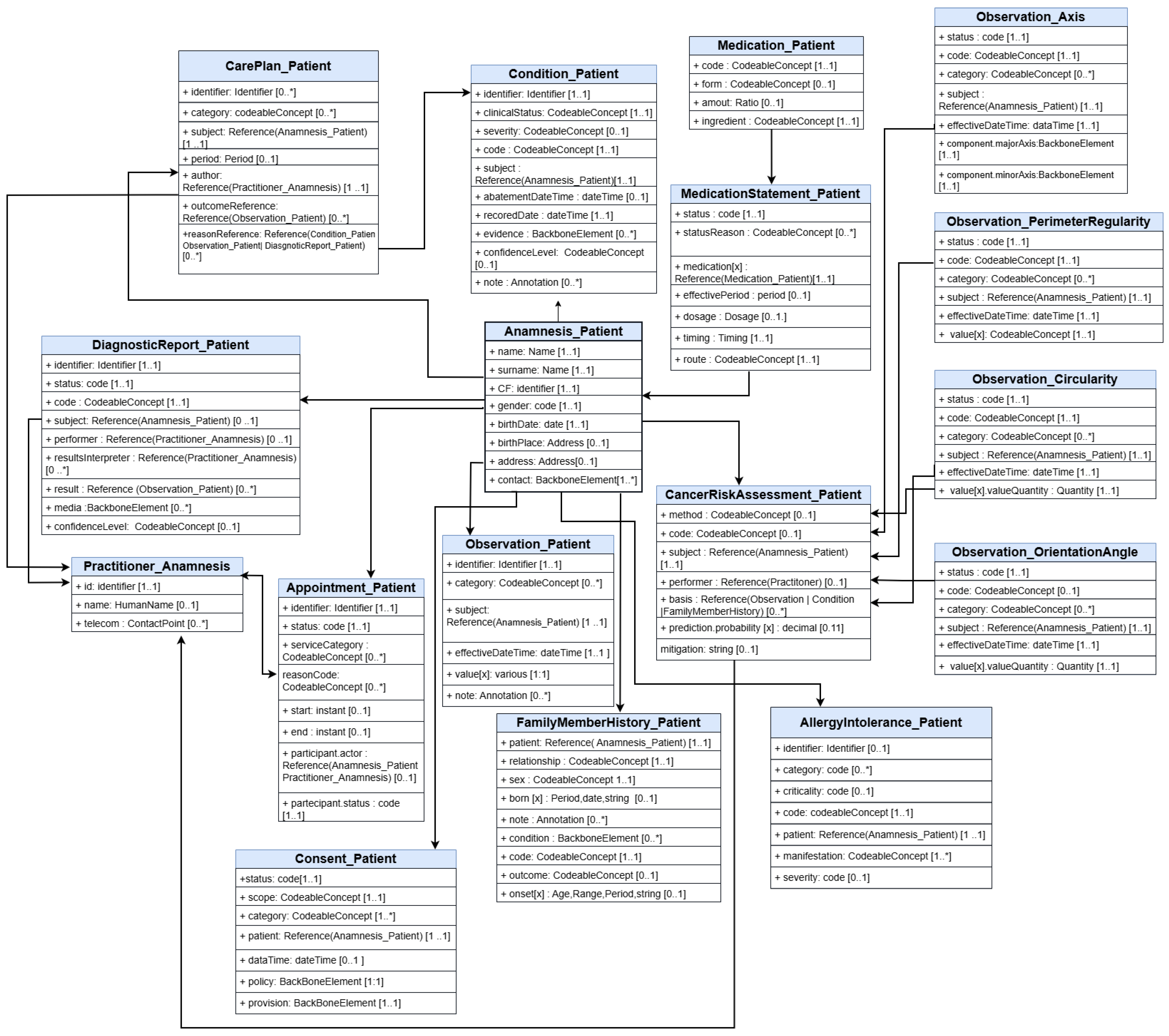 - HL7 FHIR Formalization Module (HFFM)This module allows for formalizing, through international standard HL7 FHIR profiles, the data provided by the patient during the anamnesis phase (coming from the patient’s anamnesis form), and the results of image analysis (from the DIAM). This module uses the FHIR profiles and resources (e.g., Patient, Observation, Diagnostic Report, Allergy Intolerance, Medication Statement), which are appropriately defined to ensure compliance with FHIR standards. It manages the creation of FHIR resources and carries out validation for the aim of proposed architecture.