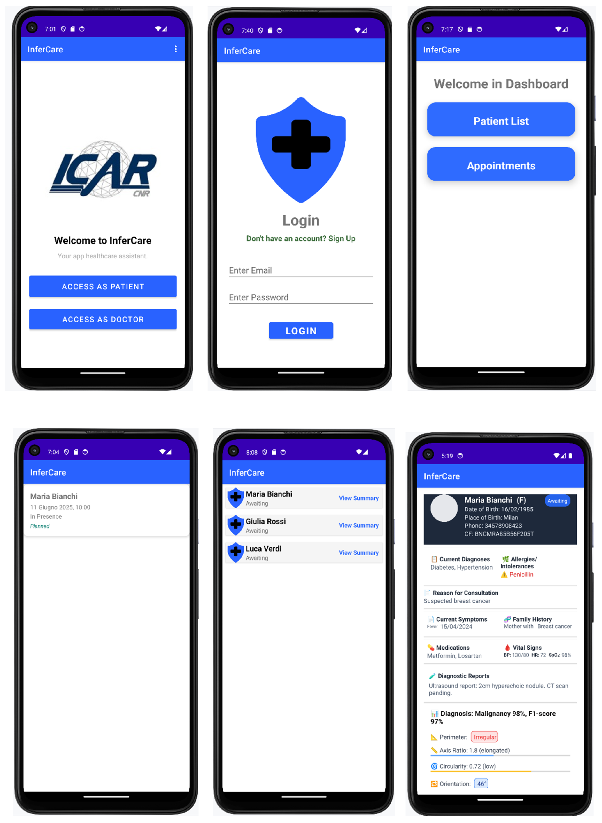- User interaction: The InferCare application offers an intuitive interface that enables seamless interaction between patients and clinicians, effectively bridging mobile health (mHealth) solutions and institutional HIS.