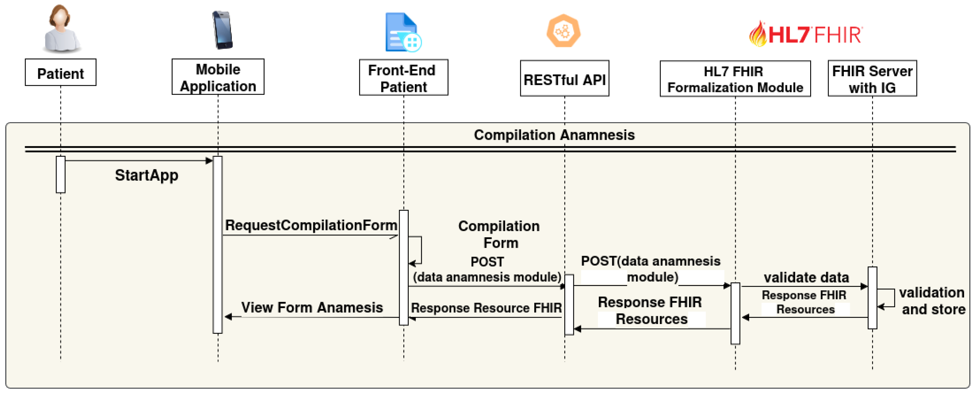 - The “RESTful API” forwards the “POST (data anamnesis module)” to the “HL7 FHIR Formalization Module”;