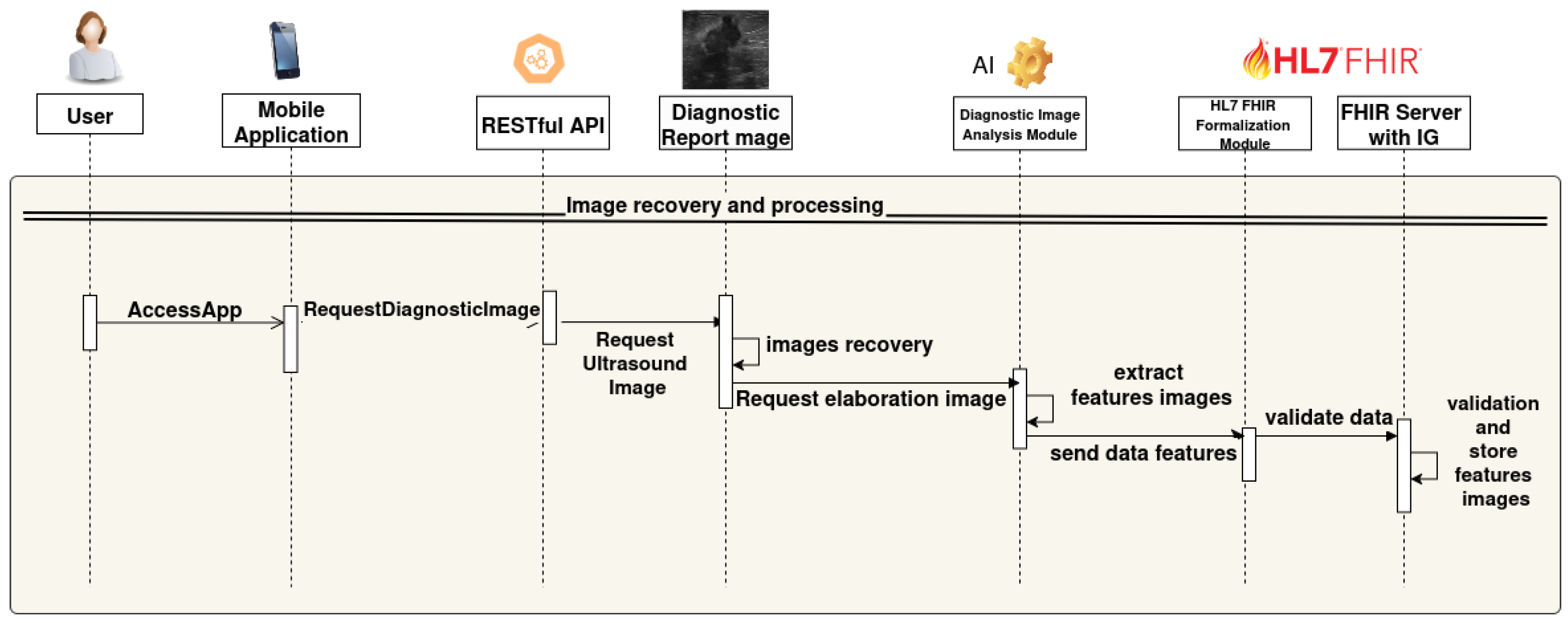 - The database receives the request (RequestDiagnosticImage), retrieves the required US images (Images recovery), and returns them.
