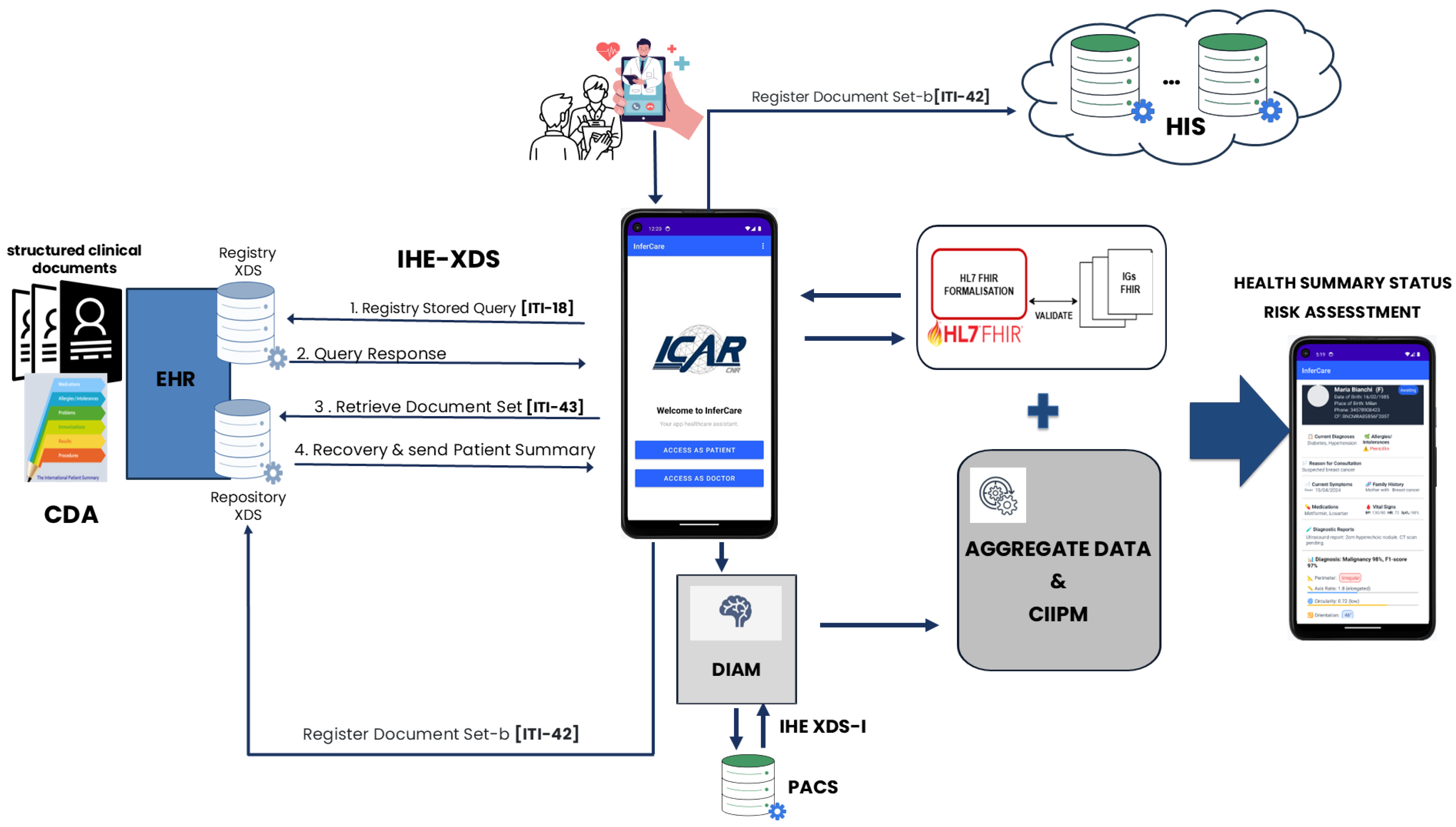 - Retrieval of Clinical Documents (EHR–IHE-XDS): the InferCare application interfaces with the EHR through the IHE Cross-Enterprise Document Sharing (XDS) standard. Using the Registry Stored Query [ITI-18] IHE transaction, the app queries the XDS Registry to identify structured clinical documents associated with the patient. The registry provides the Query Response, allowing the system to retrieve the corresponding document set (Retrieve Document Set [ITI-43]) from the XDS Repository.