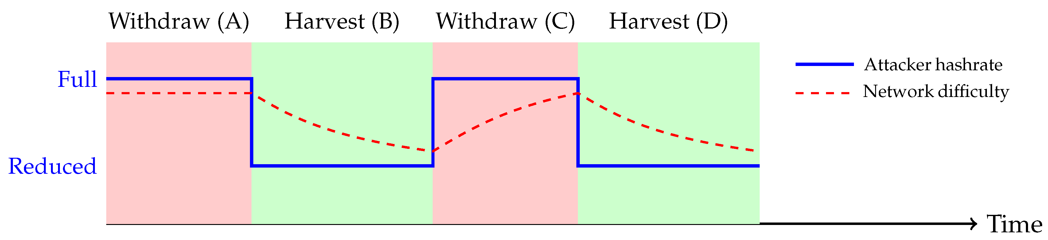 • Withdrawal phase ( τ o f f ): Adversary reduces mining to negligible level (≈ 10 % of β H ).
