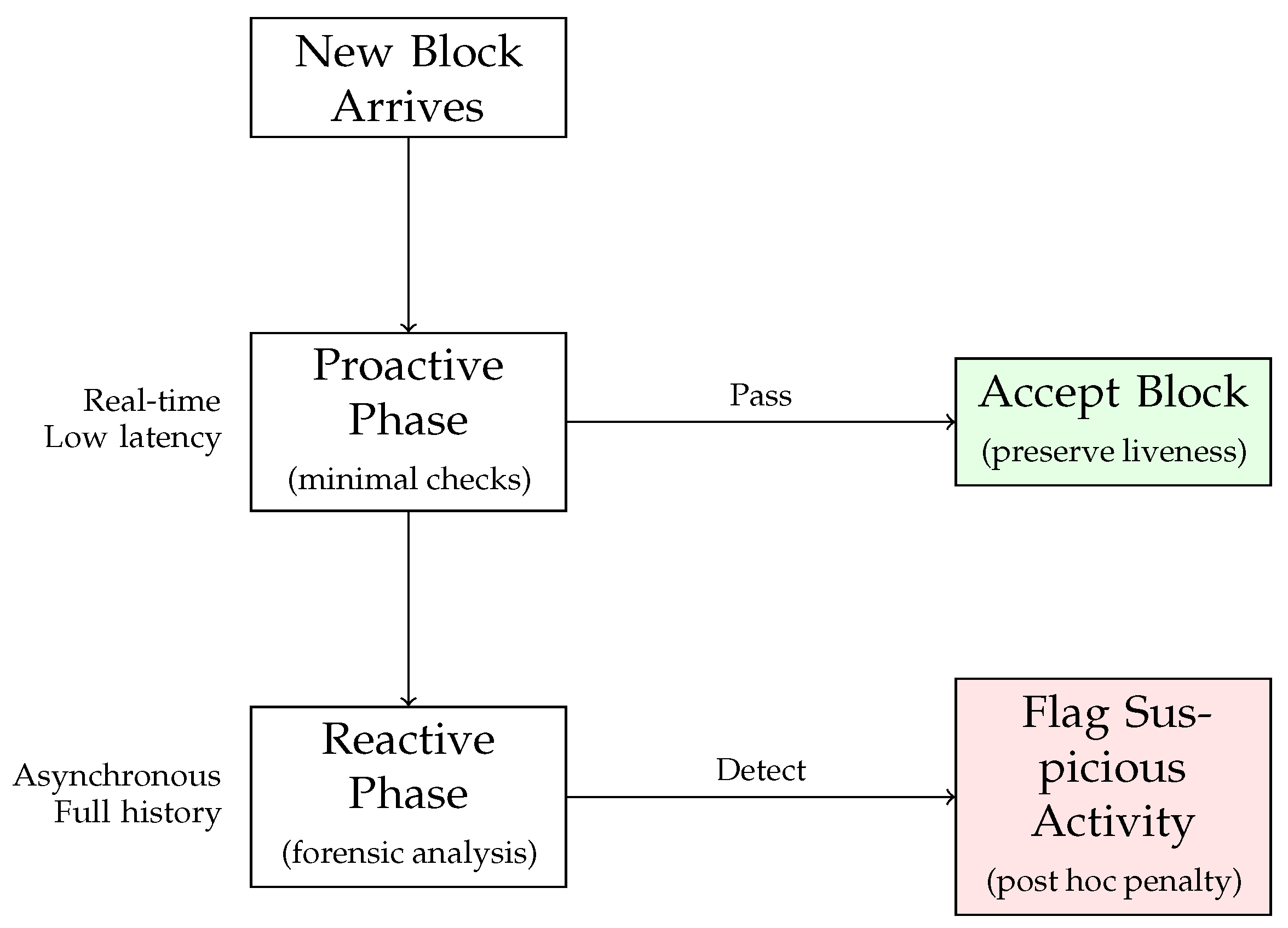 Figure 2. Framework philosophy: proactive phase accepts blocks optimistically to preserve liveness; reactive phase performs comprehensive forensic analysis asynchronously, flagging attacks for post hoc penalties without disrupting consensus.