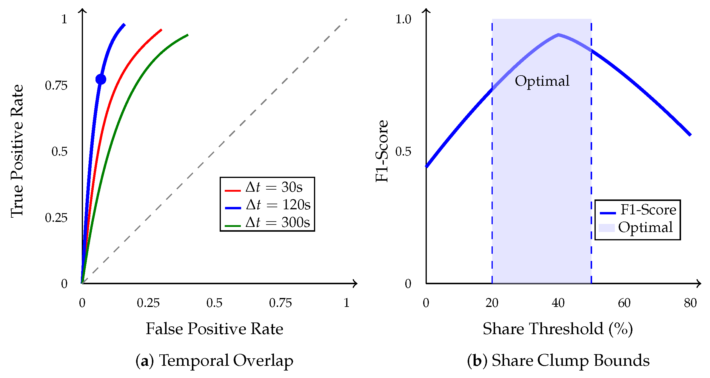 Figure 3. Sensitivity analysis for collusion grouping. (a) ROC curves for temporal overlap window: the dashed diagonal line represents random classifier performance; Δ t = 120 s achieves optimal trade-off (TPR = 0.88, FPR = 0.07). (b) F1-score vs share threshold: dashed vertical lines mark clump bounds [20%, 50%] that maximize detection while controlling false positives.