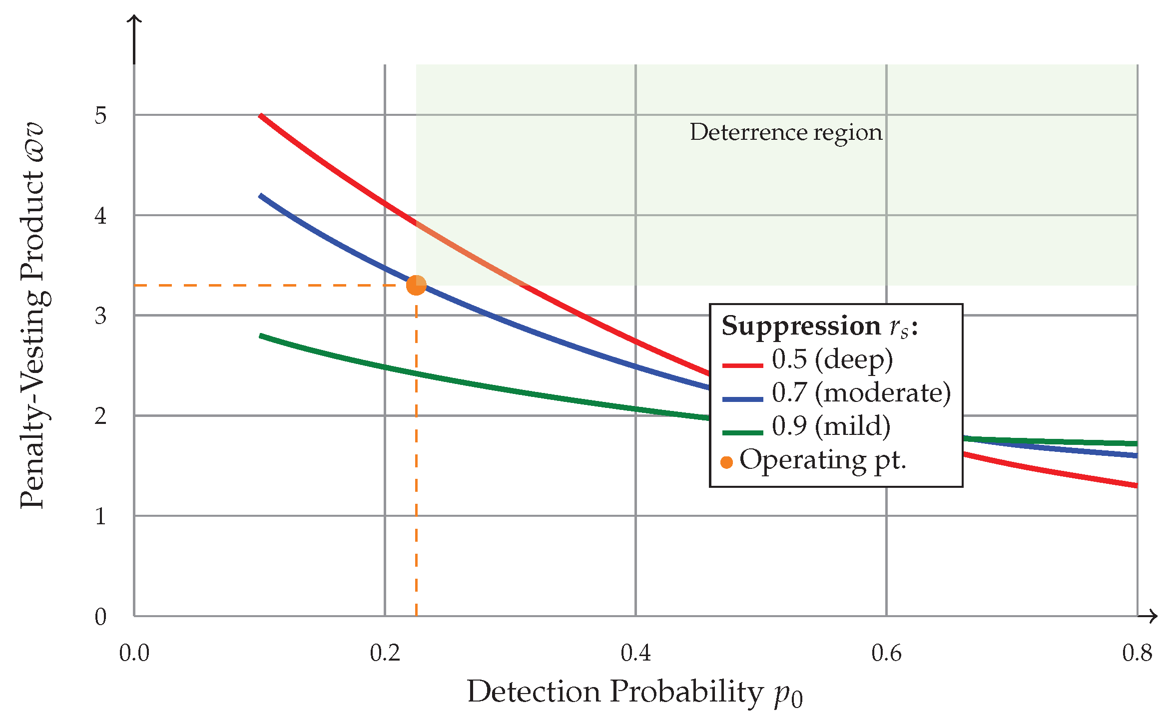 Figure 4. Sensitivity of minimum penalty-vesting product ( ϖ v ) to detection probability ( p 0 ) and difficulty suppression ratio ( r s ). Lower r s (deeper suppression) and higher p 0 reduce deterrence threshold. Operating point ( p 0 = 0.18 , ϖ v = 2.0 , r s = 0.7 ) provides safety margin across parameter regimes.