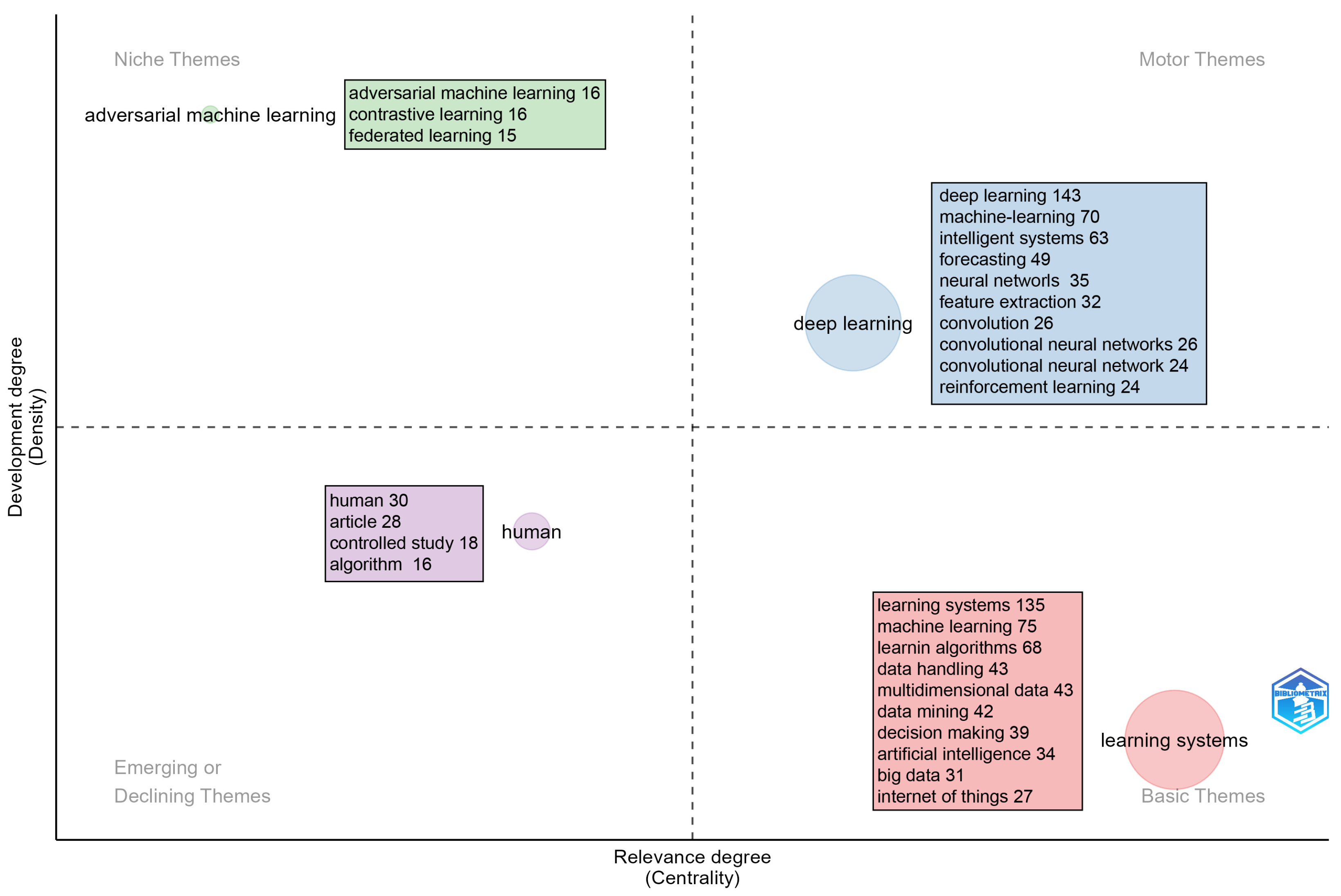 In the upper right quadrant is “learning systems”, a well-developed and highly central topic. This indicates that it is a structuring axis of the area and also maintains strong links with other topics, becoming a driver of research. Its size in the figure confirms its weight within the field. The upper left quadrant contains the topic “adversarial machine learning”, a topic with high density but low centrality. Although it is well defined and developed internally, its contribution is more marginal within the research as a whole. This positions it as a specialized niche. The topic “human” is located in the lower left quadrant, with low density and low centrality. Its location indicates that it is an underdeveloped topic with little influence in the field, which can be interpreted as an emerging but still incipient line or a declining trend. Finally, in the lower right quadrant, we see “deep learning”, characterized by strong centrality but low density. This positioning makes it an essential topic that is widely connected to others, although it does not yet have such a consolidated internal development. It is a basic topic that supports other lines of research and has the potential to evolve into driving topics.