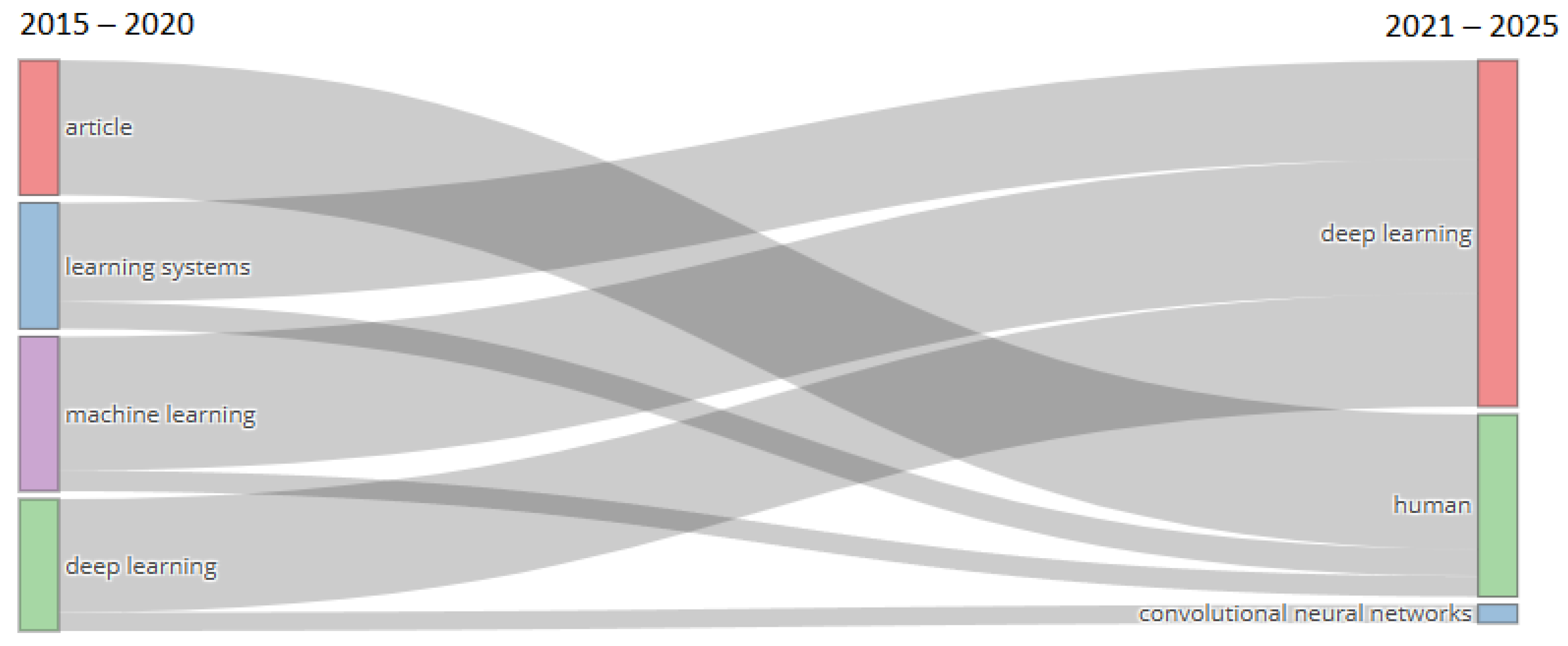 In the second period, there is a shift towards more specialized and applied areas. Machine learning and deep learning remain central, although integrated with new lines of research. At the same time, topics such as “human” emerge, reflecting the growing attention to human–machine interaction, and “convolutional neural networks”, denoting the incorporation of specific architectures in the analysis of complex data. Notably, “deep learning” remains a topic with an independent evolution, which provides opportunities for expansion toward more autonomous and adaptive learning approaches.