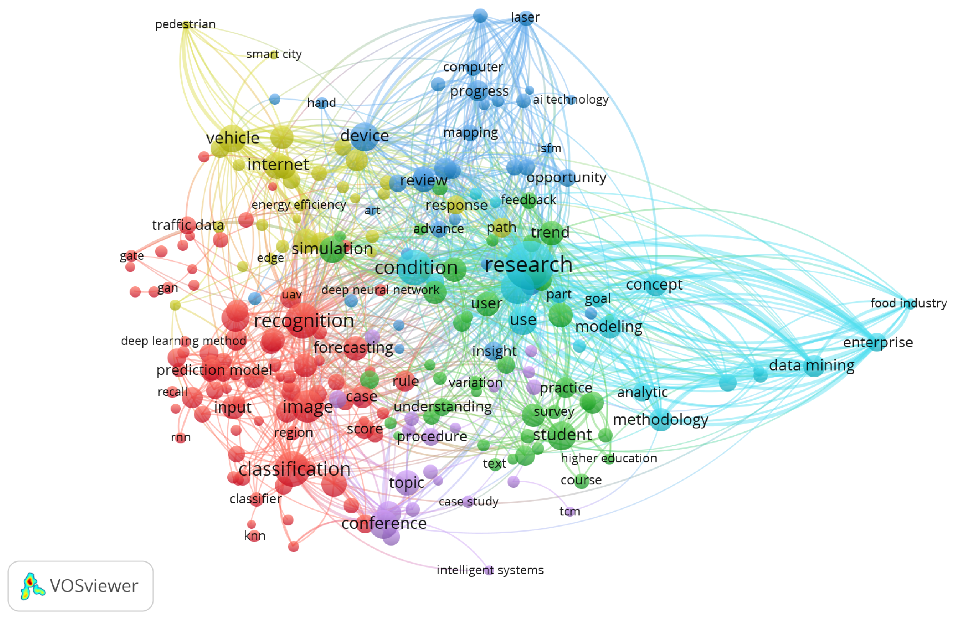 The light blue cluster focuses on terms such as research, use, modeling, concept, and data mining. This group represents an orientation toward the development of analytical models and data mining techniques applied in organizational contexts and complex systems. In the green cluster, words such as simulation, user, practice, student, course, and higher education stand out, suggesting a focus on designing user-centered (student-centered) educational experiences to improve teaching and learning processes. The red cluster groups terms such as recognition, classification, image, prediction model, and input. This segment is clearly linked to visual data processing, pattern recognition, and prediction using machine-learning models. The yellow cluster contains words such as internet, vehicle, smart city, and energy efficiency. This group points to technological applications in the field of the Internet of Things (IoT), smart vehicles, and energy efficiency. The dark blue cluster includes terms such as computer, progress, AI technology, and mapping, which refer to advances in emerging technologies in artificial intelligence and digital cartography. Finally, the purple cluster is composed of terms such as conference, topic, case study, and intelligent systems, reflecting a focus on academic production and the dissemination of knowledge in scientific forums.