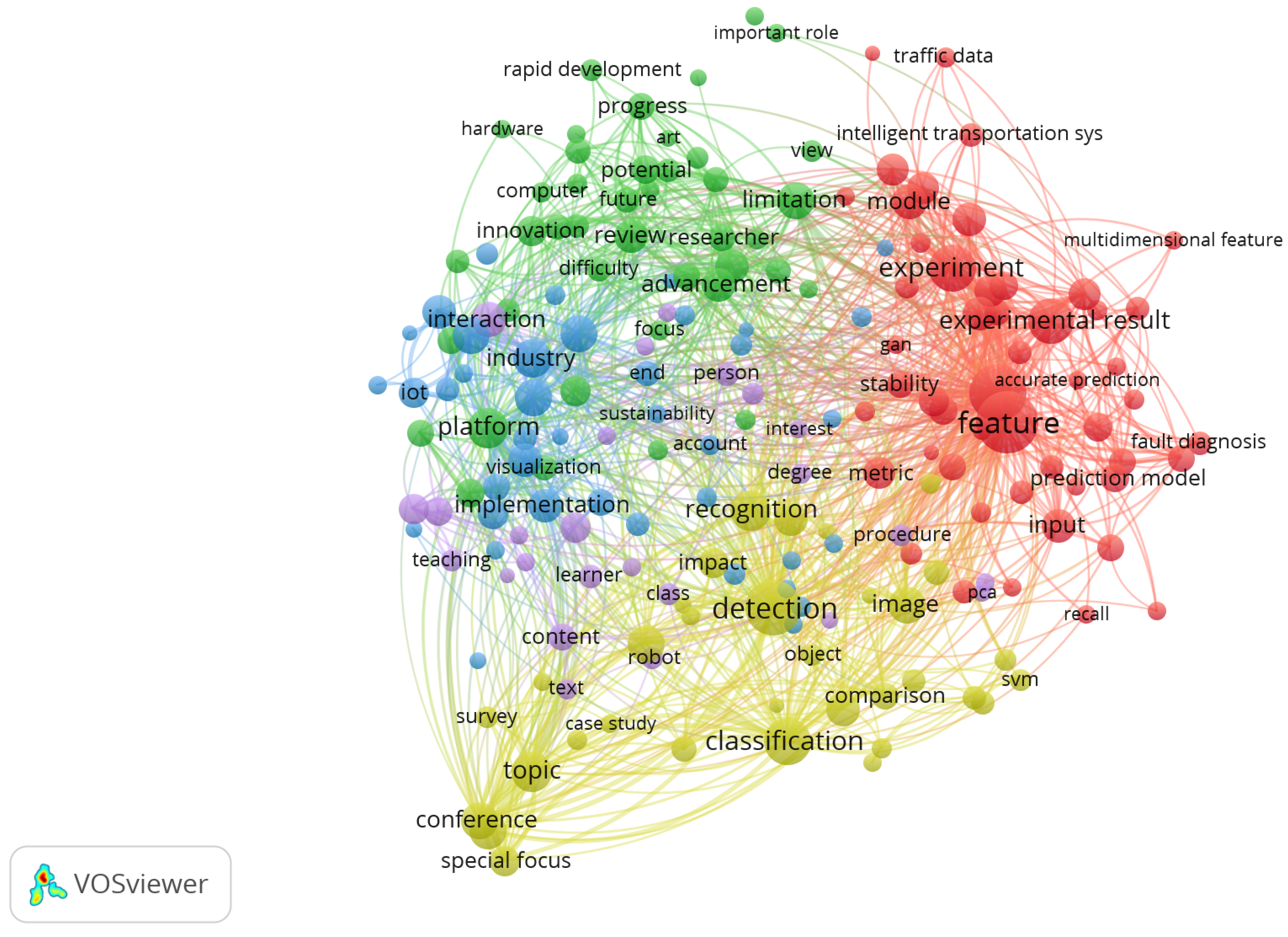 In this new co-occurrence map, significant changes can be observed in the structure of thematic clusters. One of the most notable aspects is the merging of the yellow cluster with key terms such as classification, topic, recognition, and detection. This grouping suggests a more focused approach to the analysis of classification and detection strategies applied to intelligent systems and machine learning, marking a difference from the previous map.