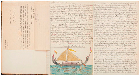 Hikayat Lonthoir, written by M.S. Neirabatij in 1922, curated from the National Maritime Museum collections, Amsterdam: The first page (left); Belang figure (Bandanese boat) (middle); and the narrative handwritten in cursive Malay (right).