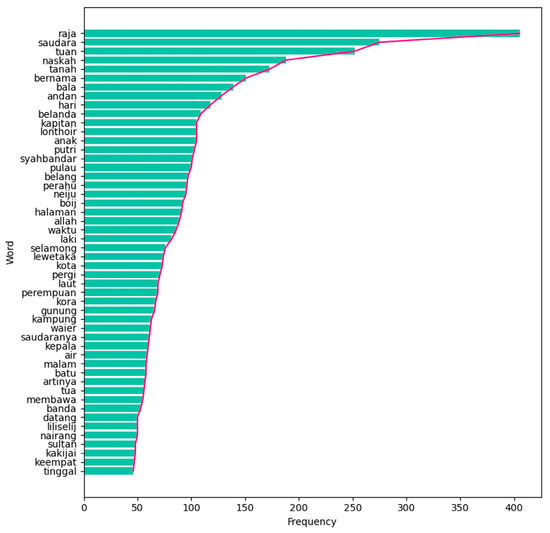 The clean list of extracted vocabularies from the manuscript constitutes unique tokens that are essential to be examined to reveal the most frequent words. This objective, in the bigger implication, will give the predominant theme depiction as the outcome of this study. The 50 most frequent words are identified and shown in Figure 5. This distribution can be described as having three main segments: the plot shows an extremely steep initial drop among the first few high-frequency words, with the most frequent word (Raja) reaching approximately 400, rapidly falling to around 200 to 250 by the fourth or fifth ranked word.