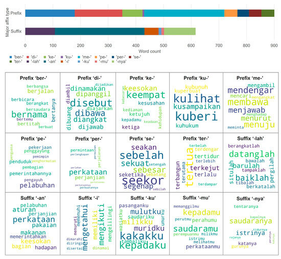 Bar charts (top) visualize the major affixed words and their frequency, clustered based on prefix and suffix. The word clouds (bottom) show the top 10 words for each cluster for prefixes (‘ber-’, ‘di-’, ‘ke-’, ‘ku-’, ‘me-’, ‘pe-’, ‘per-’, ‘se-’, ‘ter-’) and suffixes (‘-lah’, ‘-an’, ‘-i’, ‘-ku’, ‘-mu’, ‘-nya’). The yellow-to-purple color gradient indicates word frequency, with yellow marking lower frequency and purple marking higher frequency.