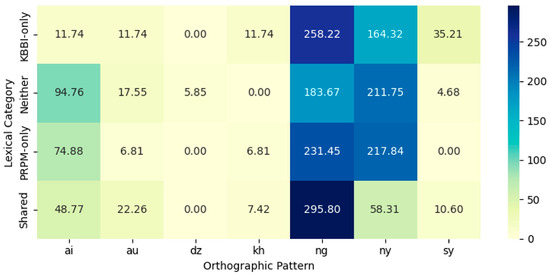 In terms of spelling signals, the referentiality to dictionaries was examined to identify orthographic patterns. Figure 7 shows the orthographic skewness per-10k-chars frequency (i.e., sy, kh, ny, ng, ai, au, dz) across categories, revealing whether sy/kh skew PRPM-only and ny/ng or certain diphthongs skew elsewhere. Word length can provide valuable insights into linguistic patterns and help us understand the nature of the vocabulary within different categories. In the “Shared” category, shorter words (typically 4–6 letters) dominate, indicating that these words likely represent core vocabulary with common roots shared between Malay and Indonesian.