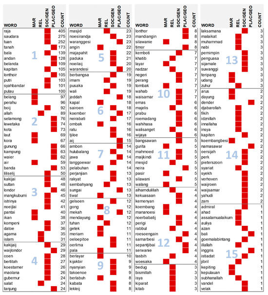 The profile of semantic patterns across four themes (Maritime, Religious, Social/Genealogical, and Place/Geographic), partitioned into 15 sequences ordered by descending word counts (see Figure 8). The class divisions were not exactly equal. Instead, this was only to map the sequential order of the persistent words based on their frequency. The sequential blocks show that Sequences 1–4 are led by maritime and social/political governance vocabulary (e.g., perahu, pelabuhan, kora, raja, tuan, kapitan, Belanda), which consistently co-activate place/geographic anchors (Banda, pulau, kota); together, these establish seaborne movement and authority relations as the narrative spine.