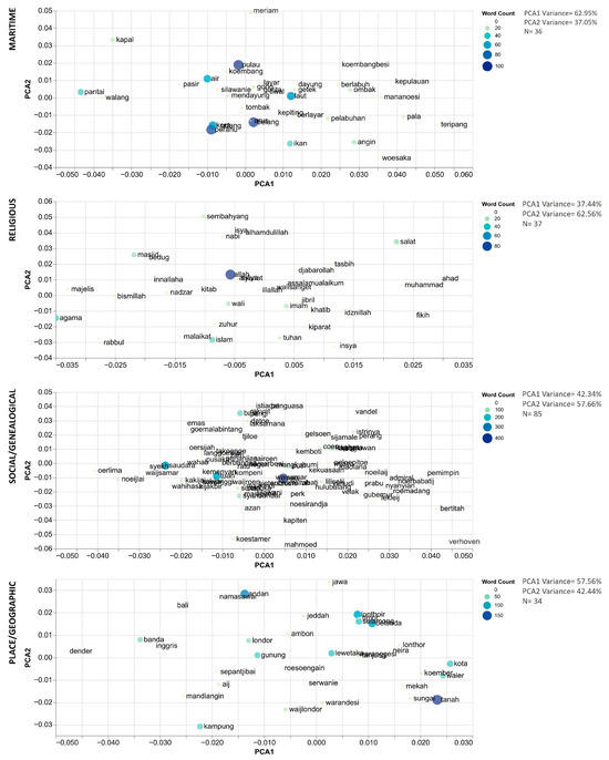 The number of clusters (K) was set to 4, defining semantic themes: Maritime, Religious, Social/Genealogical, and Place/Geographic. After the clustering process, each word was assigned a cluster label. The clusters were then reviewed manually, and based on the words present in each cluster, a semantic group label was assigned. For instance, words related to family or kinship, e.g., adik (sibling), ayah (father), were assigned to the Social/Genealogical group. Words associated with religion, e.g., Allah (God), salat (prayer), were assigned to the Religious group. Words related to places, e.g., laut (sea), pantai (coast), were grouped under Place/Geographic.