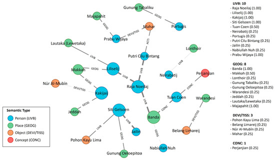 In morphological terms, action-oriented prefixes like me- (Active Voice) and di- (Passive Voice) show a densely verbal and agentive plot. The manuscript also retains the Van Ophuijsen old spelling (oe, dj, tj, j) and is influenced by Arabic and Dutch loanwords, explaining tokens flagged as proper names or domain-specific terminology. Semantic clustering indicates that the narrative is structured by maritime/politico-social themes and Place/Geographic anchors, while religious lexicon appears as concentrated spikes marking oaths, blessings, and legitimizing junctures. Network analysis quantified the centrality of key individuals, with Person entities (LIVB) holding the highest degree centrality, forming a Genealogical/Local cluster, while external figures like Tuan Coen acted as peripheral nodes linking the local narrative to conflict and power (Agreement).