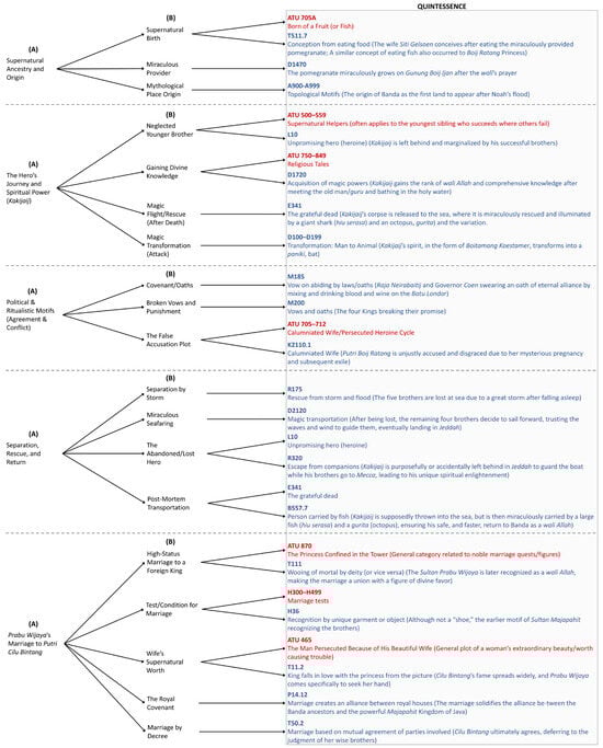 Folklorists seek to arrange the different knowledge from across literature around the world and connect them, and their recurring patterns, such as motifs, tropes, and other storytelling elements, serve as a ‘biological genes’ analogy in cultural heritage [33]. This helps folklorists understand how similar value systems are expressed in diverse cultures and how motifs evolve across regions [34,35,36]. To investigate this common thread, a cross-check was conducted against global folklore classification systems such as the Aarne-Thompson-Uther (ATU) [37] and Stith Thompson’s Motif-Index of Folk-Literature [38] (see Figure 12).