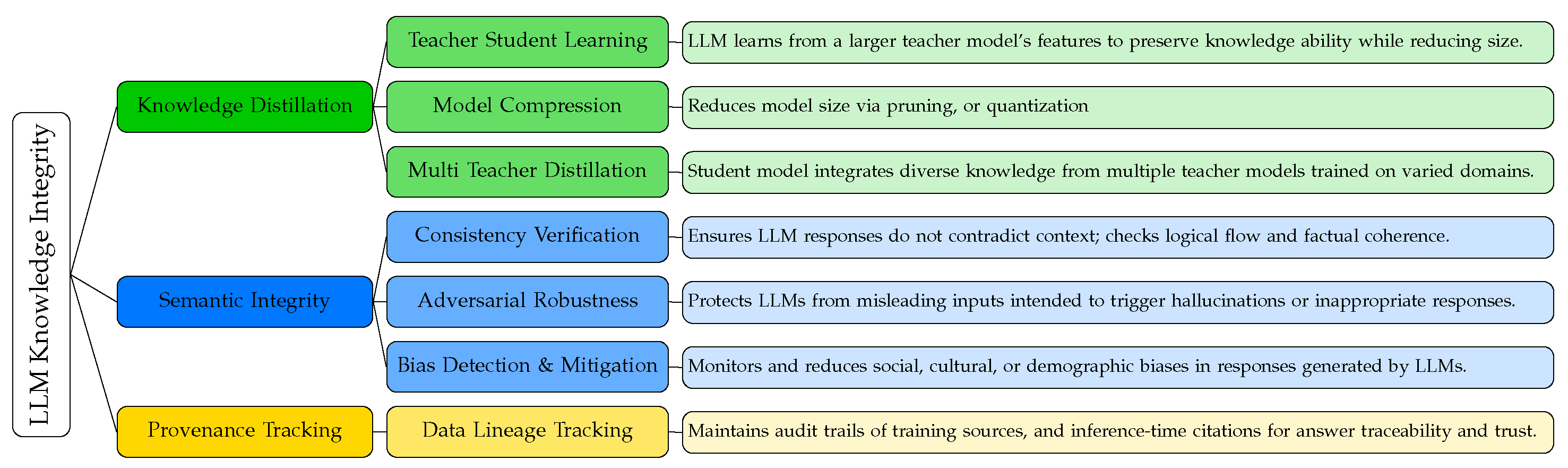 - A comprehensive taxonomy of LLM information and knowledge integrity, focusing on knowledge distillation, semantic integrity, and provenance tracking.