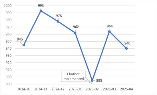 This section presents a comprehensive analysis of the effects of AI chatbot implementation in a Slovak micro-enterprise operating in the e-commerce sector. The results are divided into quantitative and qualitative findings, offering a holistic view of the chatbot’s performance from the perspectives of order volume trends, employee experiences, chatbot interactions, and customer satisfaction. It should be noted that the indicator “total inquiries” represents the total number of customer messages submitted to the system within a given month, not the number of unique customers. A single customer could generate multiple messages related to one order, while many orders required no customer contact at all. This explains the relatively high inquiry-to-order ratio observed in certain months, such as April 2025, when 581 inquiries were recorded alongside approximately 940 orders.
