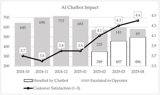 Figure 2 illustrates the shift in workload from human operators to the AI chatbot starting in February 2025. As the proportion of chatbot-handled inquiries increased, average customer satisfaction steadily rose from 3.8 to 4.4. This indicates a strong correlation between automation and improved service perception.