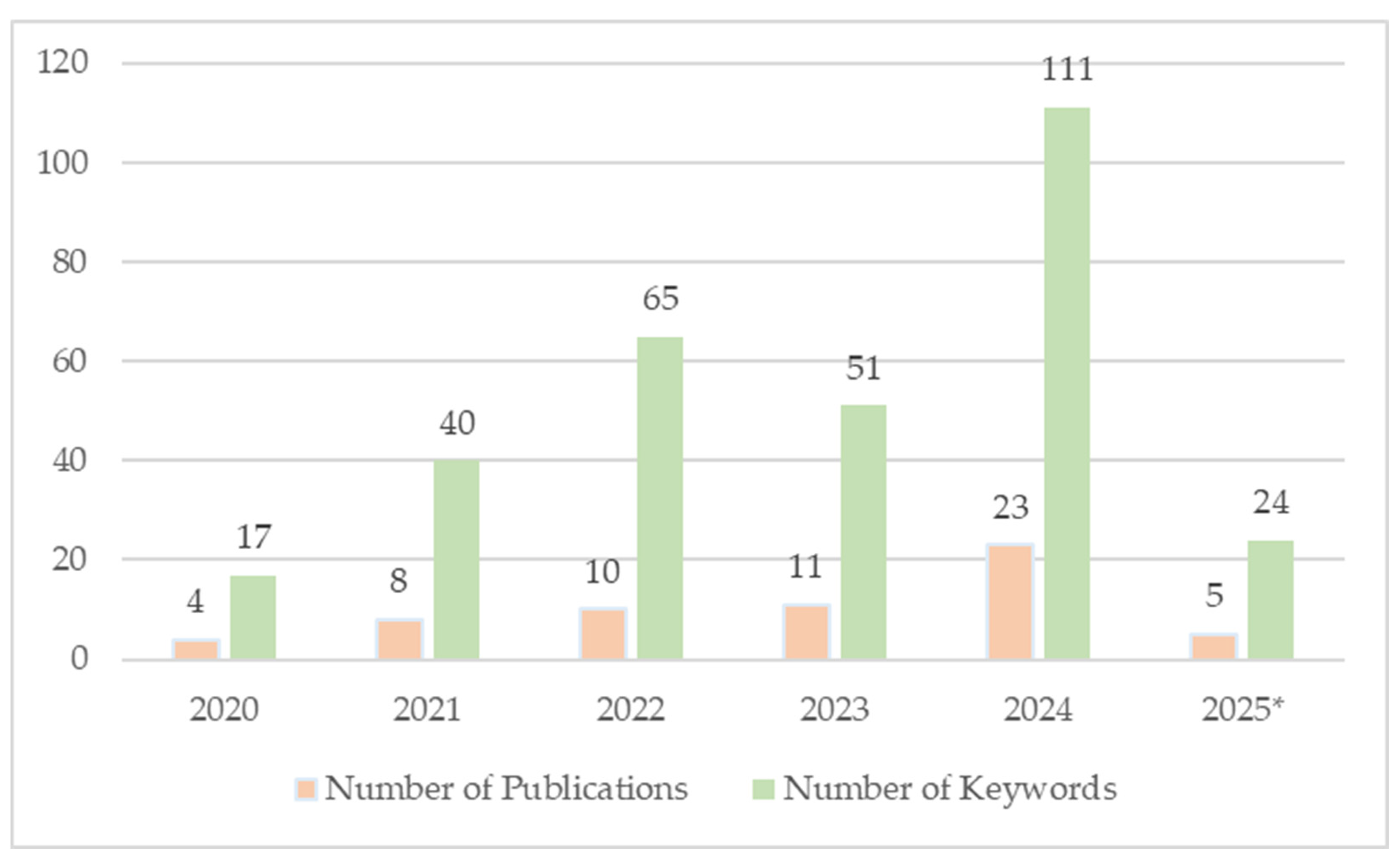 | Keywords | 2020 | 2021 | 2022 | 2023 | 2024 | 2025 * | Total |