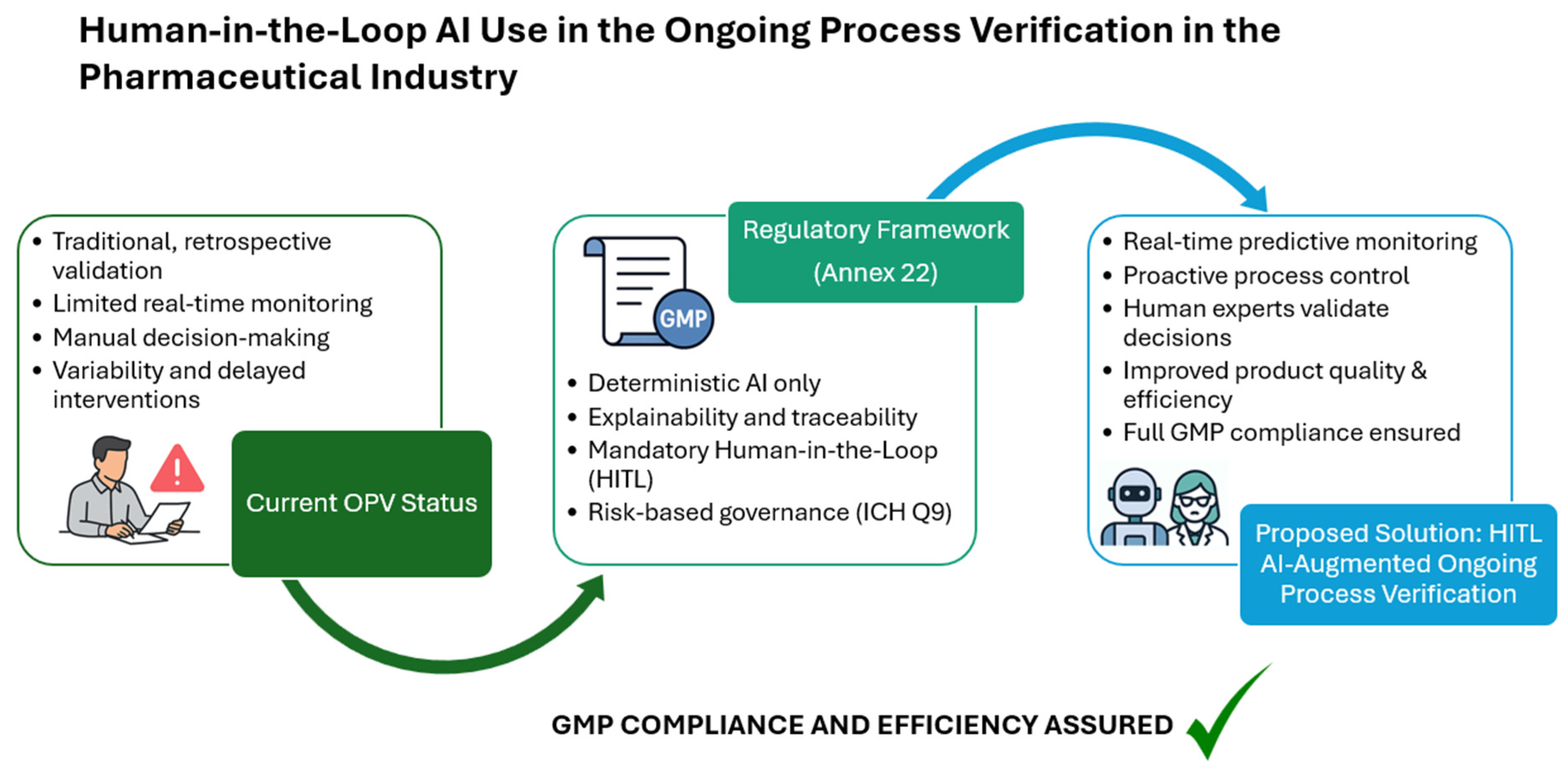 The pharmaceutical industry’s pursuit of enhanced product quality, regulatory compliance, and operational efficiency has catalyzed the integration of Artificial Intelligence (AI) into Ongoing Process Verification (OPV) frameworks. This comprehensive review examines the synergistic application of Human-in-the-Loop (HITL) AI systems within OPV, contextualized by the evolving regulatory landscape, particularly the newly introduced Annex 22 of the European Union Good Manufacturing Practices (EU-GMP). The review delineates the sector’s strategic shift from traditional validation models toward dynamic, data-driven approaches that leverage AI for real-time monitoring, predictive analytics, and proactive process control. Central to this transformation is the HITL paradigm, which ensures that human expertise remains embedded in critical decision-making loops, thereby safeguarding patient safety, product quality, data integrity, and ethical responsibility. Annex 22 explicitly mandates deterministic behavior, traceability, and explainability for AI models used in GMP-critical applications, excluding adaptive and probabilistic systems from such contexts. The document also reinforces the necessity of multidisciplinary governance, rigorous validation protocols, and risk-based oversight throughout the AI lifecycle. This paper synthesizes current industry practices, regulatory expectations, and technological capabilities, offering a structured framework for compliant AI deployment in OPV. By aligning AI implementation with Annex 22 principles and existing GMP frameworks (e.g., Annex 11 and ICH Q9), the pharmaceutical sector can harness AI’s transformative potential while maintaining robust regulatory compliance. The review concludes with actionable recommendations for integrating HITL AI into OPV strategies, fostering a resilient, transparent, ethical, and future-ready manufacturing ecosystem.