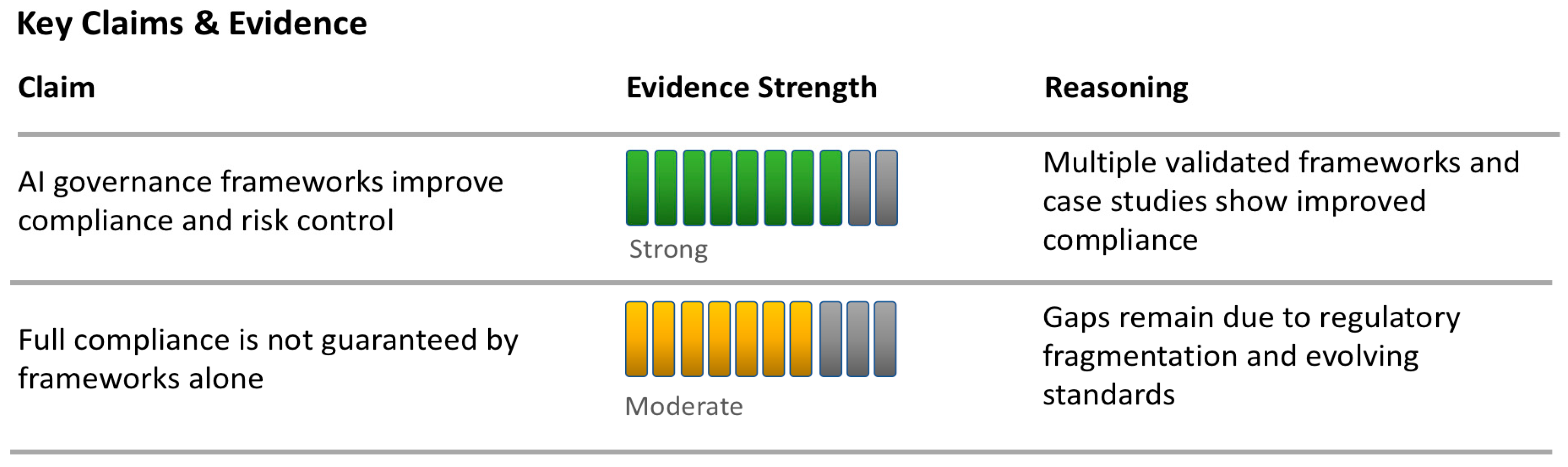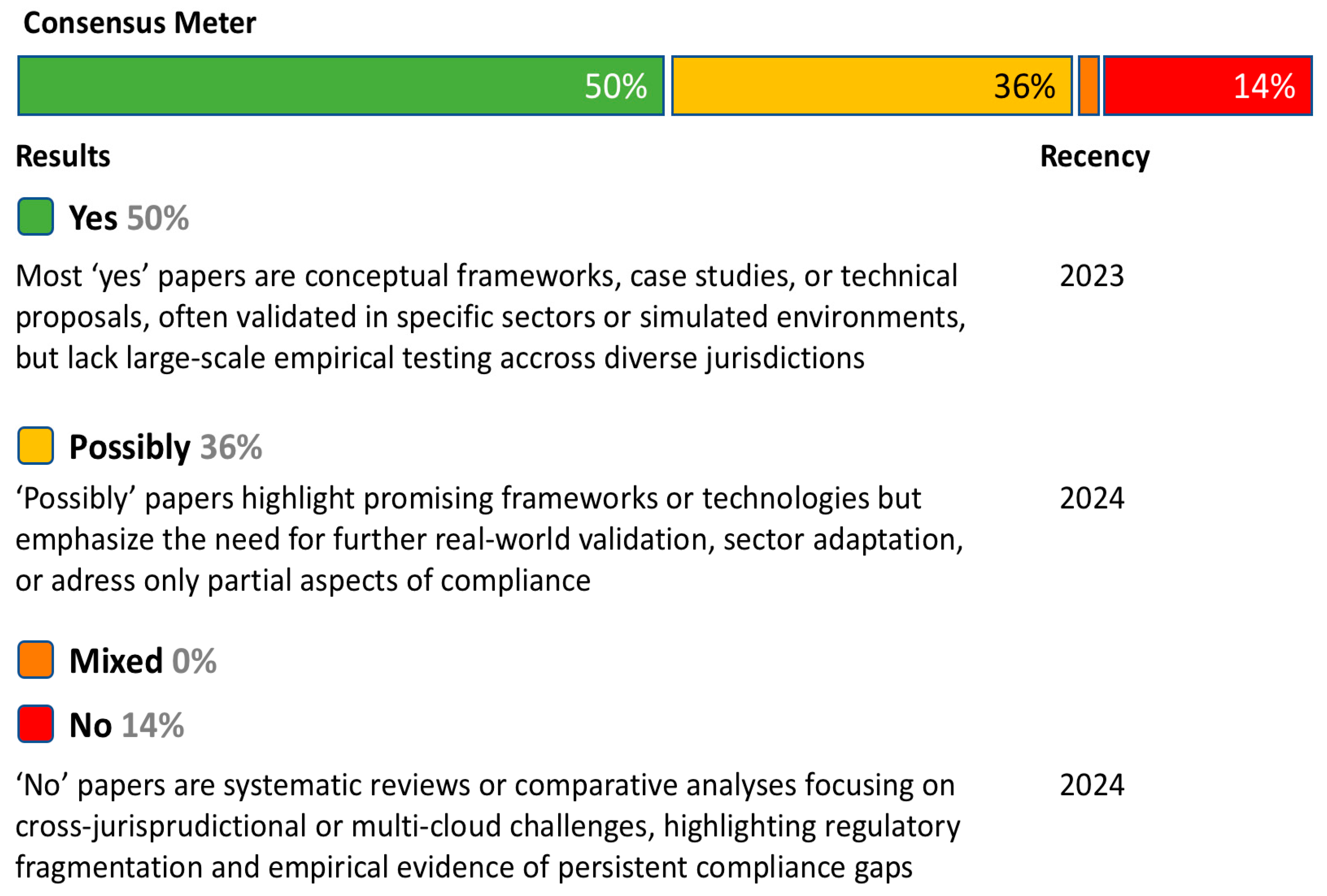 Figure 2. Consensus meter key claims and evidence. Created by the authors with Consensus.app with the prompt “can AI based systems significantly enhance regulatory compliance” (executed on 10 November 2025). Evidence strength is visually represented: green = strong, yellow = moderate.