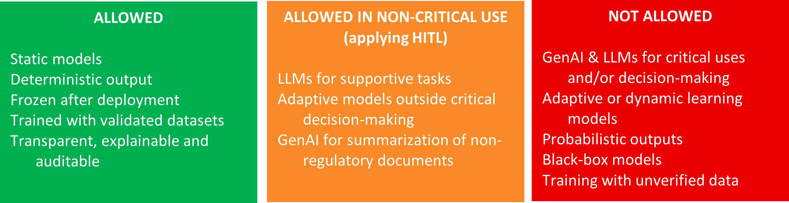 Annex 22 to Volume 4 of the EU GMPs marks a significant regulatory milestone. This annex provides targeted guidance on the use of AI in GMP-critical applications, complementing existing frameworks and establishing stringent requirements for model validation, explainability, and performance monitoring, and explicitly excludes adaptive, probabilistic, and generative AI models from critical use cases [8].