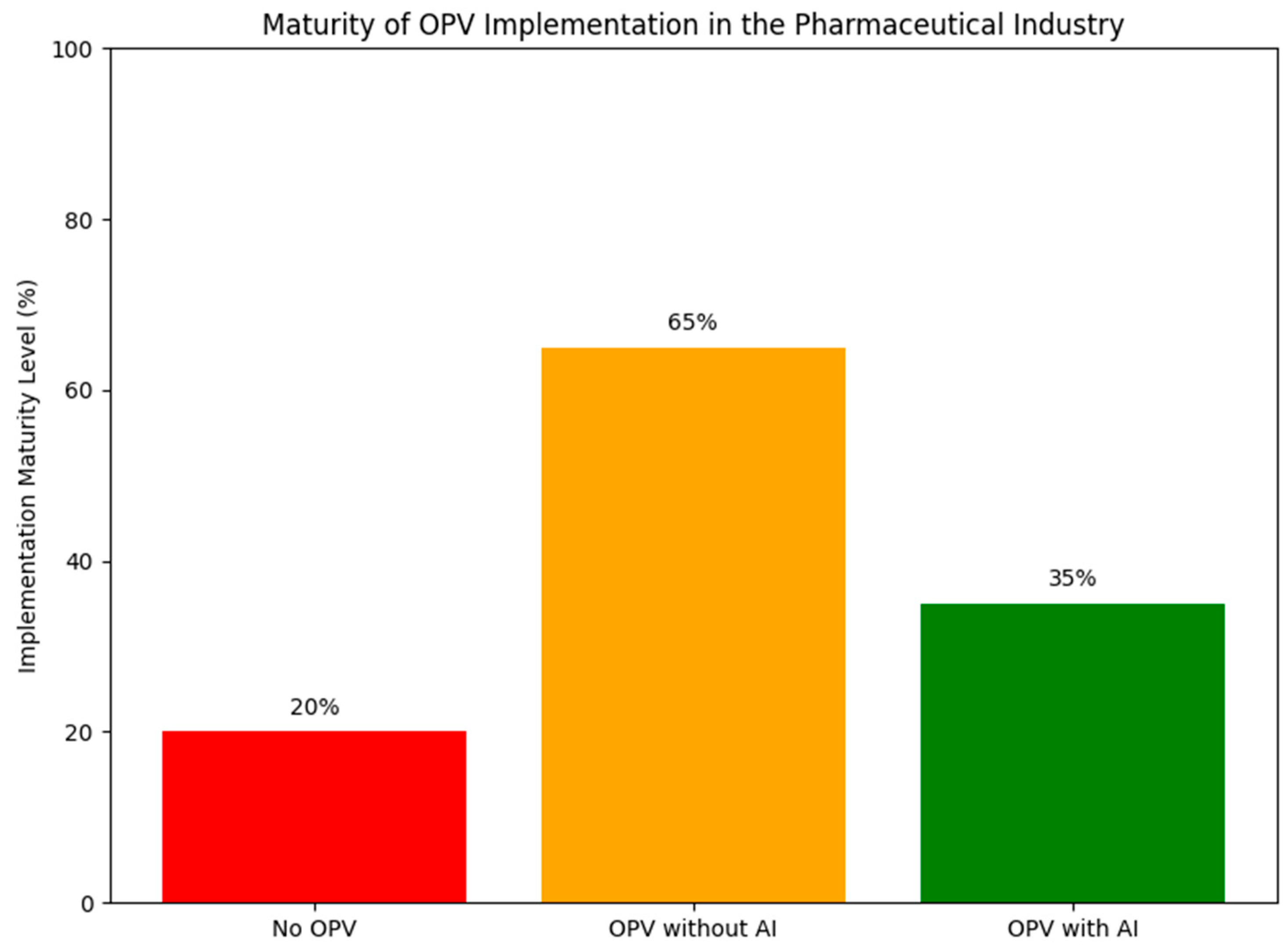 Recent industry analyses indicate a varied maturity in the implementation of OPV across the pharmaceutical sector. Approximately 20% of manufacturers operate without formal OPV frameworks, relying instead on legacy validation models. In contrast, traditional OPV—based on statistical process control and retrospective data analysis—has achieved widespread adoption, with an estimated maturity level of 65%. The integration of AI into OPV, while promising, remains in a developmental phase, with only 35% of companies actively piloting or deploying AI-enhanced OPV systems (see Appendix A, Figure A1).