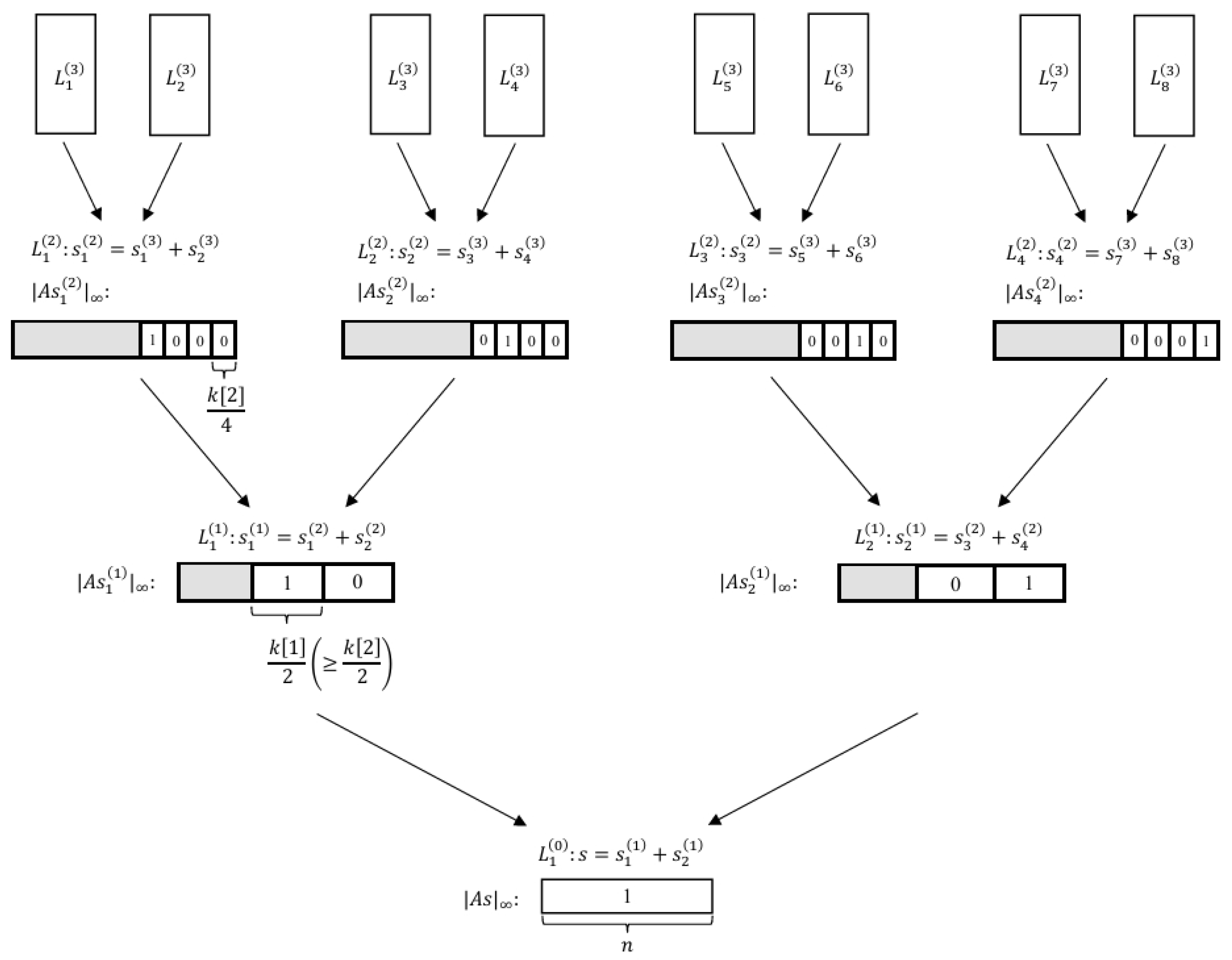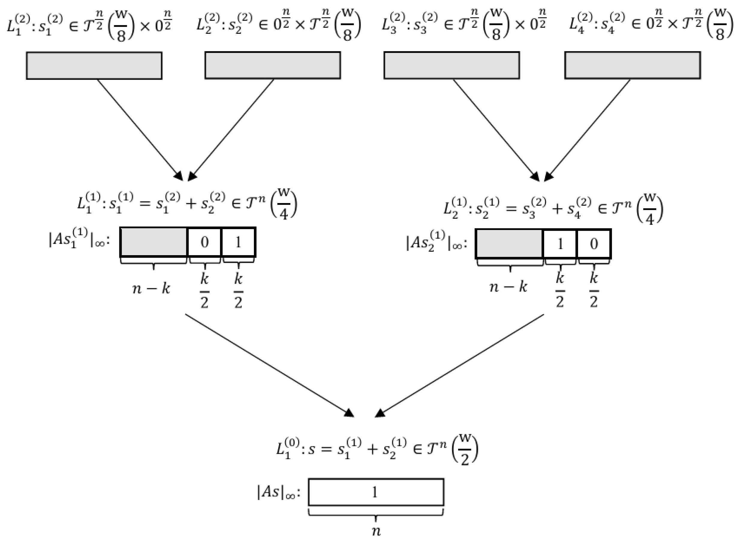 The insertion or deletion of x subsequently triggers updates in the level-1 list , which is formed by merging and . Specifically, this requires inserting or deleting all elements that are constructed by pairing x with some , where x and y satisfy the matching conditions on k coordinates: approximate matching on coordinates and exact matching on the other coordinates.