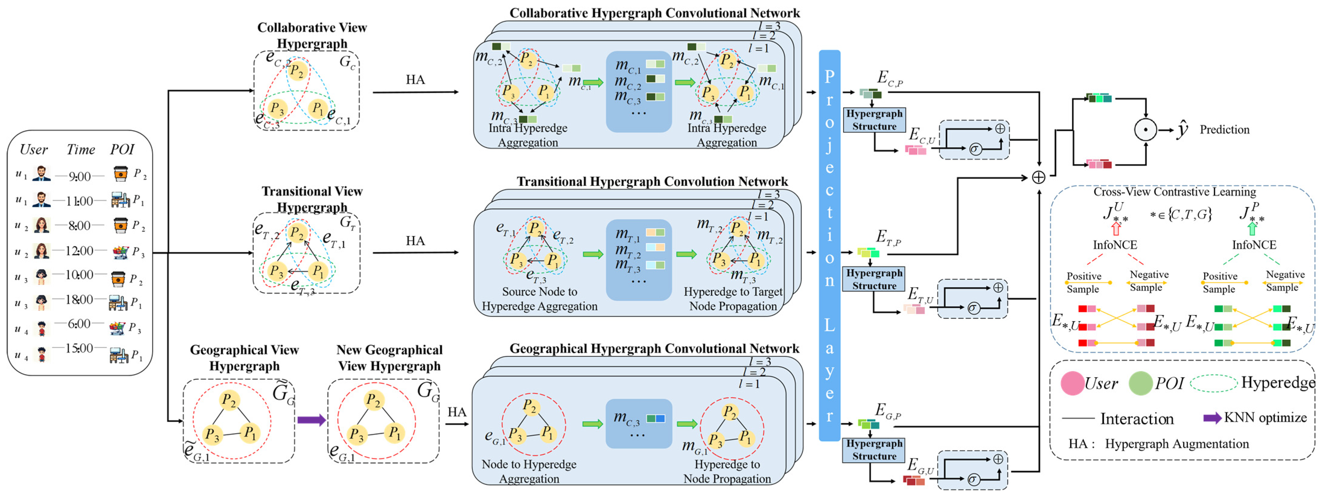 - DCHL [22]: A decoupled hypergraph contrastive learning model that explores multiple potential factors underlying user behavior via a multi-view design, and enhances user and POI representations across views through cross-view contrastive learning.