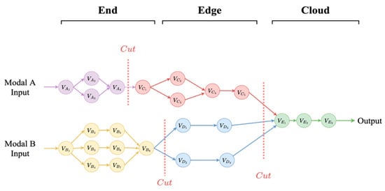 Deploying increasingly complex deep neural networks (DNNs), particularly large-scale multimodal models, on resource-constrained end devices presents a fundamental conflict between model performance and system constraints such as latency and energy consumption. To resolve this conflict, the Cloud-Edge-End collaborative inference architecture has emerged as a dominant paradigm [11,12]. This hierarchical approach strategically distributes the computational workload by leveraging the distinct and complementary capabilities of each tier: the virtually unlimited resources of the cloud for heavy, non-time-sensitive computations; the low-latency processing power of edge servers for intermediate, time-critical tasks; and the immediate data access and local processing capabilities of end devices for lightweight preprocessing or executing initial model layers [13,14].
