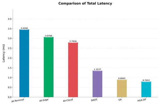 As shown in Figure 3, deployment strategy significantly impacts total inference latency. The network-intensive All-Cloud (2.79 ms) and All-Edge (3.08 ms) strategies suffer from high communication overhead. Conversely, the All-Terminal strategy (3.46 ms), while free of network delay, is constrained by on-device computation. The DADS heuristic, which focuses on minimizing latency, reduces this to a more competitive 1.35 ms. In contrast, optimization-based methods deliver substantial improvements. A standard GA reduces latency to 0.89 ms, but our HGA-DP sets a new benchmark at just 0.80 ms. This represents an 77% reduction from the All-Terminal baseline and a further 11.1% improvement over the standard GA, showcasing its superior balancing of computation and communication.