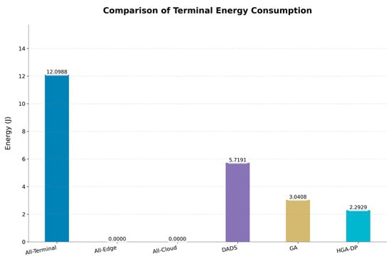 From the perspective of terminal device sustainability, energy consumption is a critical factor. Figure 4 illustrates that the All-Terminal strategy is the most power-intensive, consuming 12.10 J. While the All-Cloud and All-Edge strategies eliminate terminal computation energy entirely, they do so at the cost of the high latencies shown previously. Notably, the latency-centric DADS approach consumes a considerable 5.72 J, underscoring the trade-off of its single-objective focus. The standard GA offers a reasonable compromise, reducing energy to 3.04 J. Our HGA-DP excels further, lowering the terminal energy consumption to only 2.29 J.