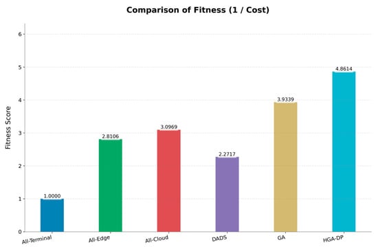 While the All-Terminal strategy is normalized to a fitness of 1.0, the full-offloading strategies (All-Edge and All-Cloud) achieve better scores of 2.81 and 3.10, respectively. DADS performs similarly with a fitness of 2.27, highlighting that optimizing for latency alone does not yield a globally optimal solution. The standard GA improves the solution quality significantly, achieving a fitness of 3.93. Crucially, our HGA-DP reaches a fitness score of 4.86, which is approximately 1.24 times higher than the standard GA and nearly 4.9 times better than the All-Terminal baseline. This demonstrates that HGA-DP does not merely optimize for a single metric but discovers a globally superior partitioning strategy that harmonizes the competing demands of performance and energy efficiency.