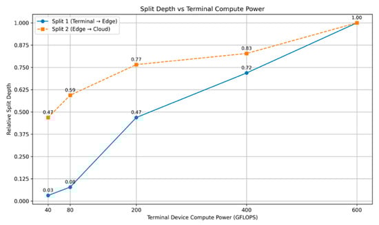 In this analysis, we held the edge and cloud resources constant while only varying the terminal’s power. For each power configuration, we ran the HGA-DP algorithm to find the optimal partitioning scheme and recorded the locations of the two primary split points: from Terminal to Edge (Split 1) and from Edge to Cloud (Split 2). The y-axis in the figure, “Relative Split Depth,” is a normalized metric that quantifies the cumulative fraction of the model’s total FLOPs executed before the split. A depth of 0.0 represents the model’s input layer, while 1.0 represents its final output layer.