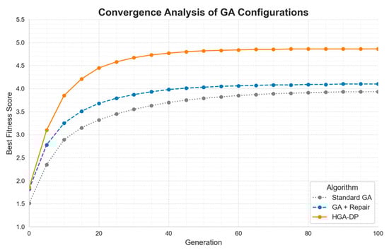 To provide a more comprehensive view of algorithm efficiency, we also analyzed the convergence behavior, as shown in Figure 7. The graph clearly demonstrates that the additional operations in HGA-DP, which incur a modest runtime overhead (Table 3), are a highly effective investment. While the baseline GA stagnates at a suboptimal level, our HGA-DP not only converges significantly faster but also achieves a superior final fitness score. This rapid convergence to a high-quality solution directly justifies the computational cost, affirming that the extra operations are crucial for escaping local optima and discovering a better deployment strategy.