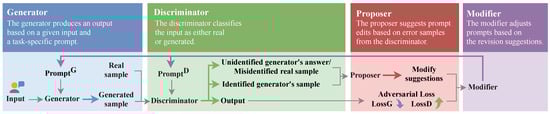 In addition, a modifier module refines the prompts based on the discriminator’s judgments and revision suggestions. It generates new instruction-example pairs, and the system selects the optimal pair based on the computed loss value to update both the generator and the discriminator. The detailed training procedure is illustrated in Figure 2.