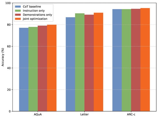 To encourage diverse outputs, we set the temperature to 0.6 for the generator, proposer, and modifier, while the discriminator operated with a temperature of 0 for deterministic judgment. Considering the training cost, we set the number of reasoning paths evaluated by the verifier to 3. All datasets are configured with 5 samples, except for Letter, which is set to 4. More details about the parameters can be found in Appendix B. During the experiments, the log-probabilities of the output tokens are used as a reference signal for computing the loss. For each dataset, we initialized the generator prompt and discriminator prompt as follows. The instruction for the generator was set to “Let’s think step by step” [10]. We adopted initial demonstrations for the generator based on prior work [48]. For the discriminator , we extended the adv-ICL [29] discriminator prompt by incorporating an explicit reasoning requirement: “Judge whether the answer is the correct ground truth or a generated fake answer, and provide the reasoning process. You should make a choice from the following two options: (A) correct ground truth, (B) generated fake answer.” The initial demonstrations for the discriminator used input–output pairs from the generator as input, while the output was constructed by directly appending to the input under a zero-shot prompting setting using GPT-4, to elicit the model’s reasoning process. The detailed prompts can be found in Appendix C.