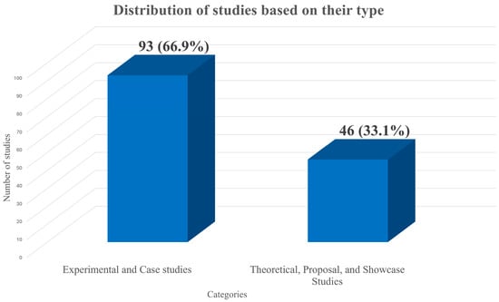 Based on the distribution of the studies to the related categories which is showcased in Figure 2 and Table 1, it can be seen that most documents fall under the Experimental and Case studies category (n = 93, 66.9%), followed by those in the Theoretical, Proposal, and Showcase Studies (n = 46, 33.1%). These results indicate that the related literature is predominantly empirical in nature, with experimental and case studies forming the majority of the research output. This fact suggests a strong emphasis on practical implementation and real-world evaluation over theoretical development or conceptual exploration.