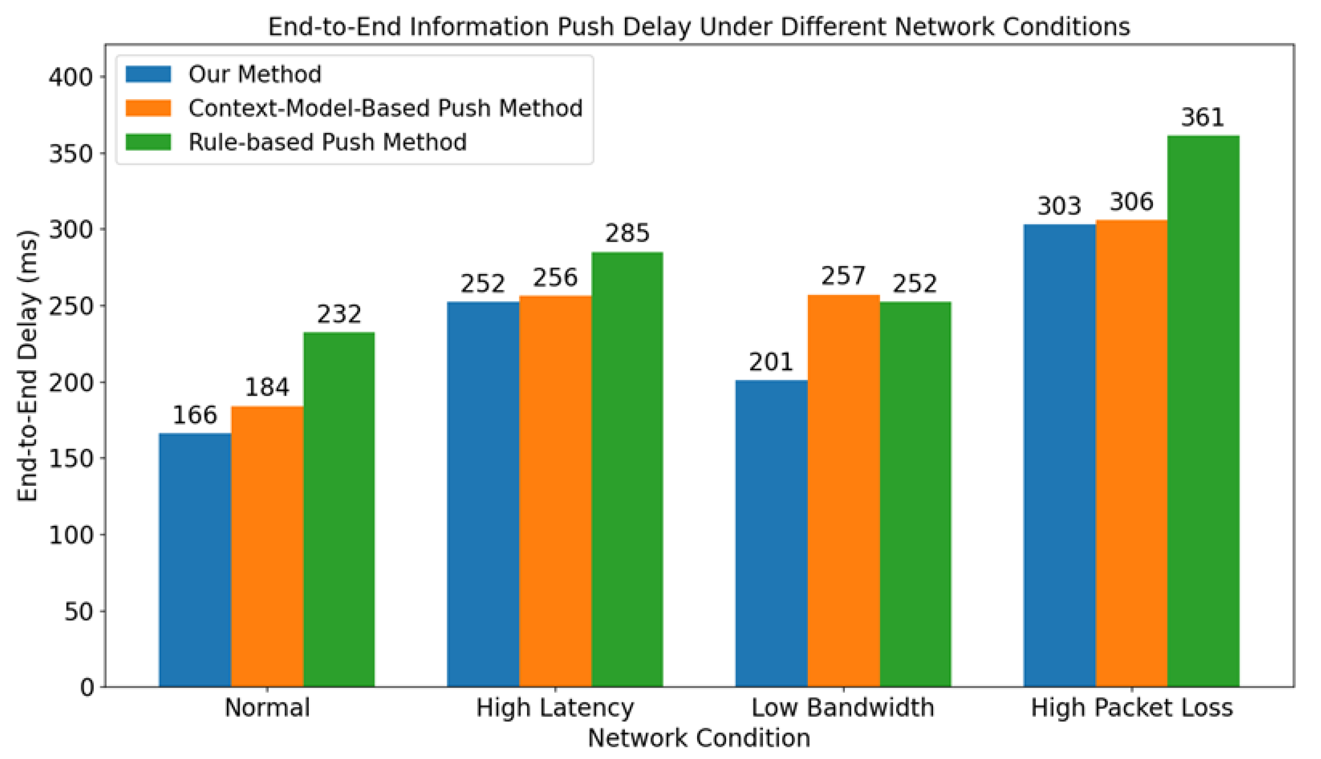 - Information push latency: For this, we will precisely measure the total time elapsed from the moment the AR terminal begins collecting device operating status data () until the final AR guidance information is successfully displayed on the AR terminal screen (). This total time will comprehensively cover the entire information processing and transmission chain. Its calculation formula can be expressed asFurthermore, this total delay can be decomposed into the sum of delays of each key link:where represents data collection time, represents AR terminal local preliminary processing time, represents data upload time, represents cloud server decision making time, represents the time for decision information to be transmitted back to the AR terminal, and represents the time for the AR device to complete rendering and present to the user.