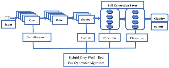 The hyperparameters necessitate modification throughout the training of neural networks and the process of weight optimization. Consequently, various researchers have employed optimization algorithms such as Adadelta, rmsprop, Adamax, Adagrad, and Adam to facilitate the adjustment of hyperparameters [48,49,50]. A multitude of hyperparameters, encompassing the quantity of neurons within the fully connected layer, the pooling layer, the convolutional layer, and the hidden layers, must be meticulously calibrated during the neural network development phase.